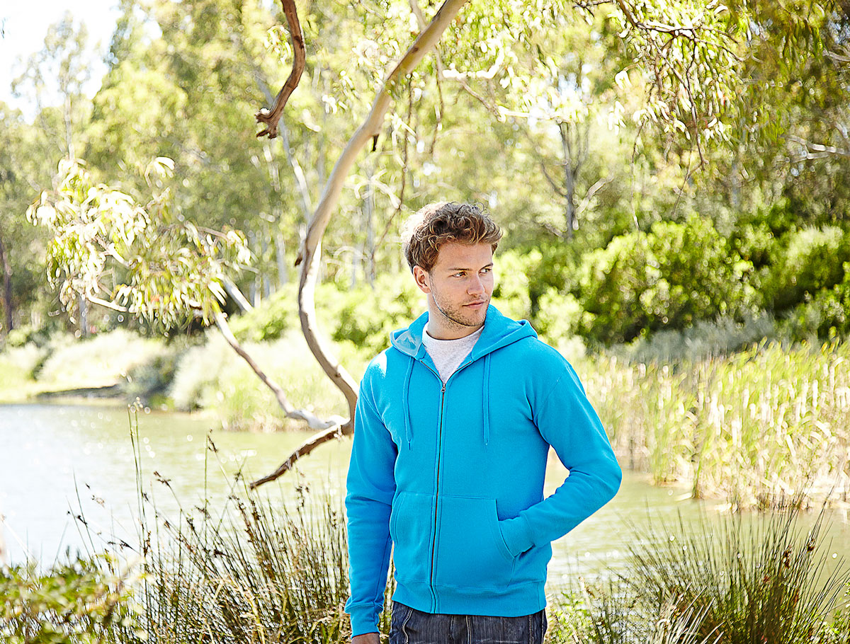 Bluza wykonana z przędzy Belcoro® miększej w dotyku i lepszej w procesie nadruku. Kaptury z podwójnego materiału. Płaski sznurek w tym samym kolorze, pojedyńcza taśma na karczku. Zakryty suwak dla lepszego nadruku. Dwie przednie kieszenie. Ściągacze przy mankietach i w pasie wykonane z taśmy bawełnianej z dodatkiem Lycry®.