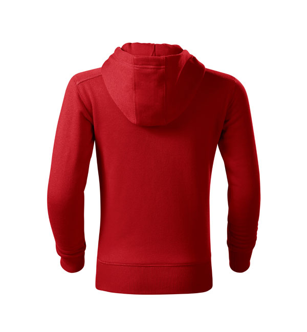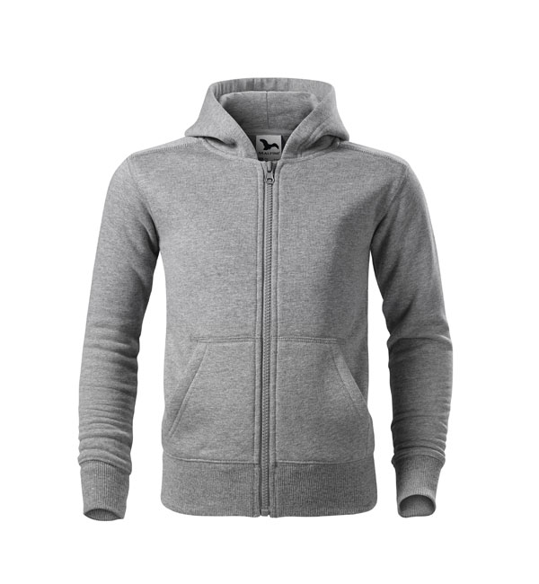 Dziecięca bluza zapinana na zamek z kapturem i przednią kieszenią przypominająca typ „kangurek“. Kaptur z podszewką i sznurkiem. Kieszenie przeszyte ozdobnymi szwami. Lamówka dolna oraz mankiety rękawów wykonane ze splotu żeberkowego 2x2 z dodatkiem 5 % elastanu. Wewnętrzna tylna część u szyji wykończona taśmą. Doskonała pod nadruk i haft.