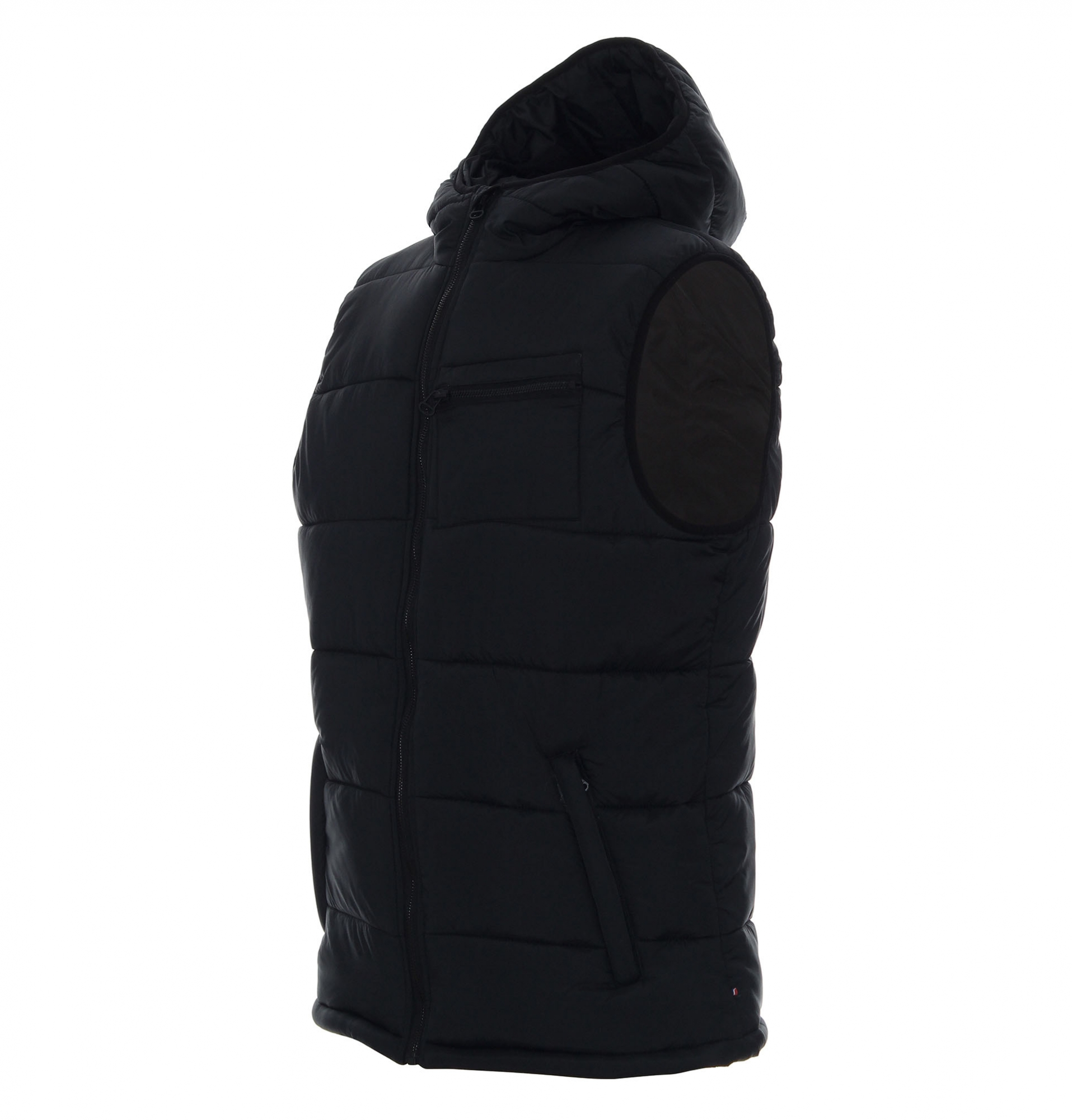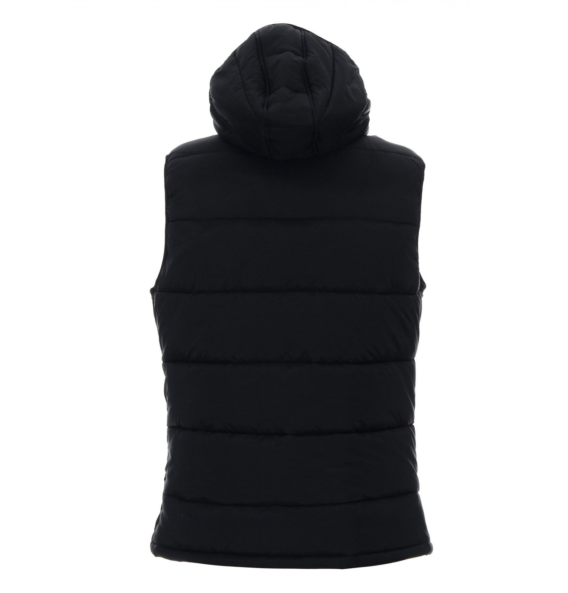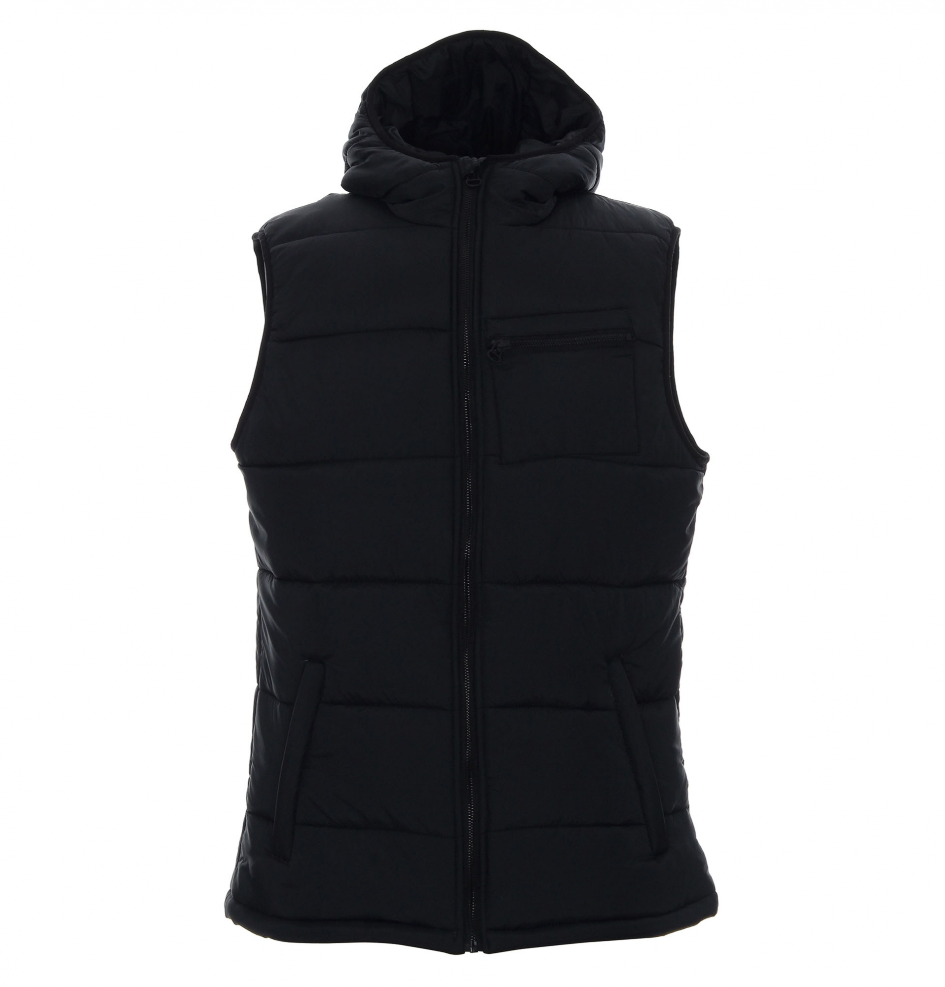 Pikowana kamizelka z kapturem, metalowy zamek główny i kieszeni na piersi, kieszenie boczne zamykane na zamek nylonowy; rękawy i kaptur wykończone elastyczną taśmą