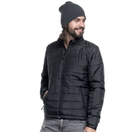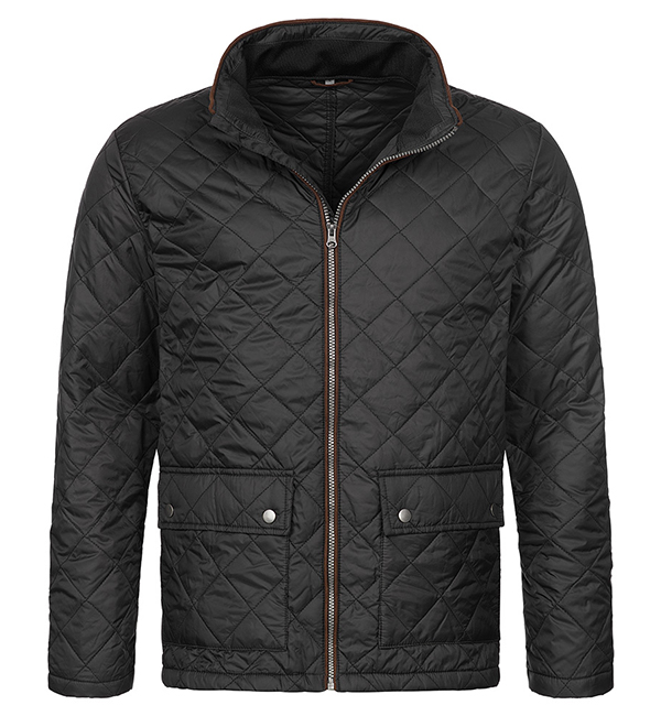Lekka męska kurtka pikowana z wytrzymałej tkaniny poliestrowej z ciepłym wypełnieniem poliestrowym. Z modnymi detalami, takimi jak lamówka na kołnierzu i z przodu oraz wieszaczek (skóra syntetyczna).