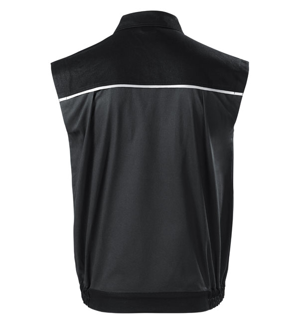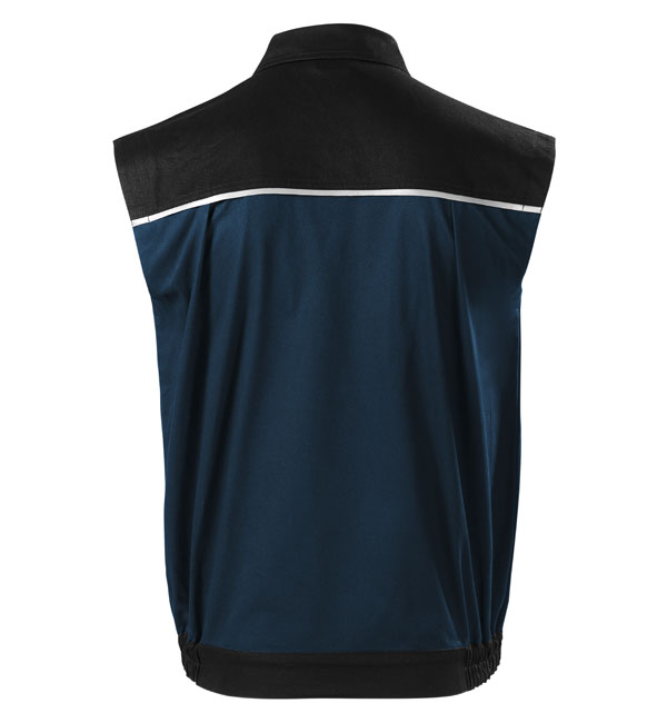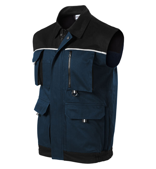 Wygodne i wytrzymała kamizelka robocza. Splot płócienny; taśma odblaskowa na pzredniej i tylnej częśi kamizelki; kieszenie multifunkcyjne, pętleka do zawieszenia; elastyczne dolne, boczne częsci kamizelki; w tylnej części zakładki zwiększające swobodę ruchu.