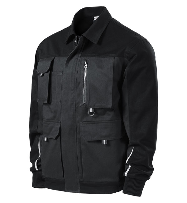 Wygodne i wytrzymała kurtka robocza. Splot płócienny; taśma odblaskowa na plecach i rękawach; rękawy z elastycznym mankietem; kieszenie multifunkcyjne; elastyczne dolne, boczne częsci kurtki, pętelka do zawieszenia; w tylnej częsci zakałdki zwiększające swobodę ruchu.