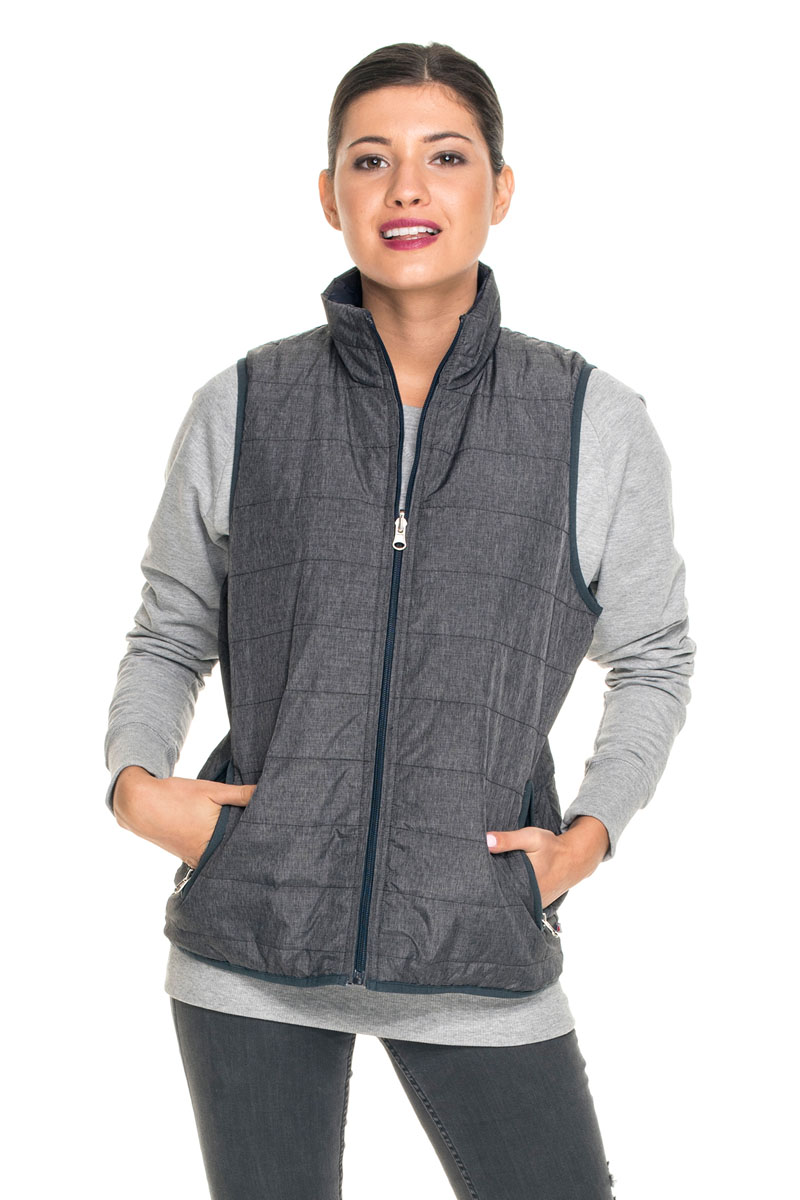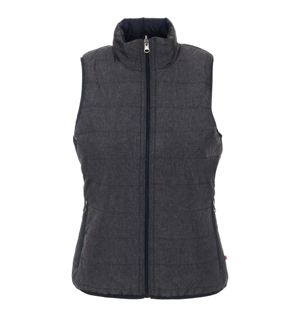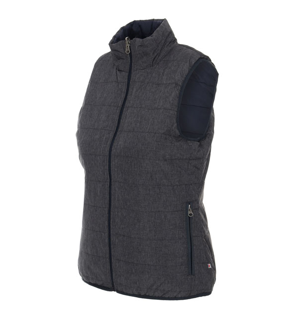 Dwustronna, lekka, pikowana kamizelka; kołnierz ze stójką; dopasowany krój; nylonowy zamek główny i kieszeni; dół kamizelki, ramiona oraz otwory kieszeni wykończone elastyczną taśmą.