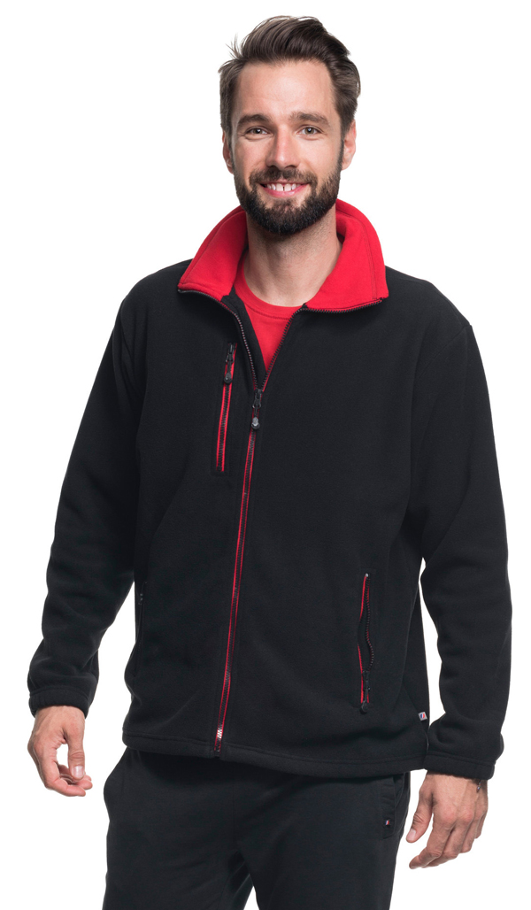 Męski ciepły polar; ozdobne wstawki; plastikowe zamki kostkowe; system ściągaczy u dołu wewnątrz; wykończenie antypilingowe.