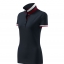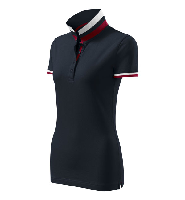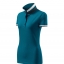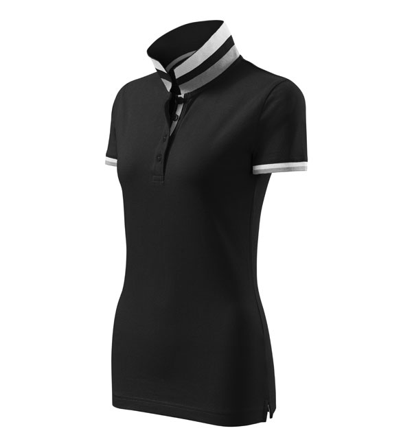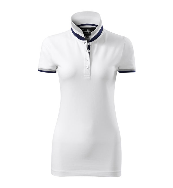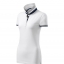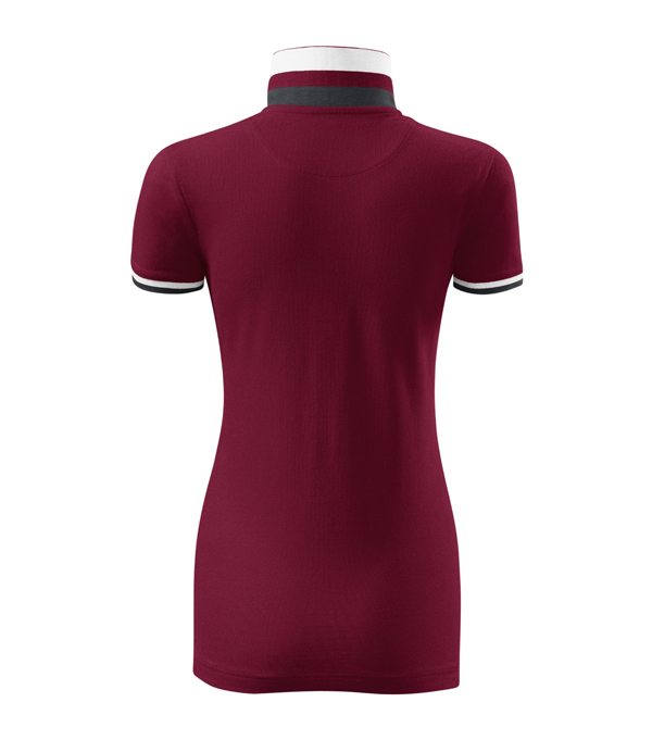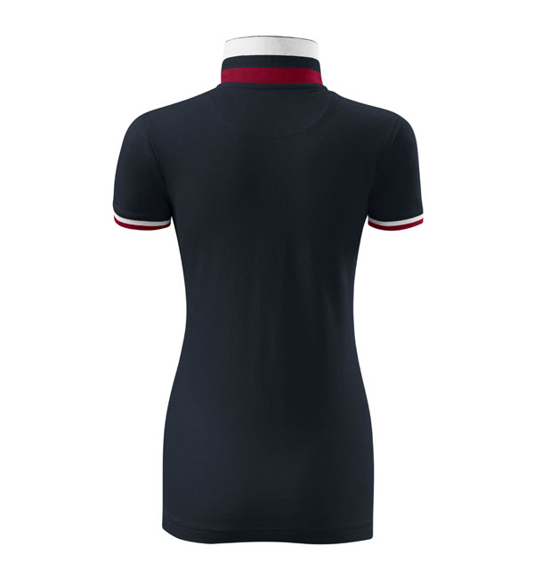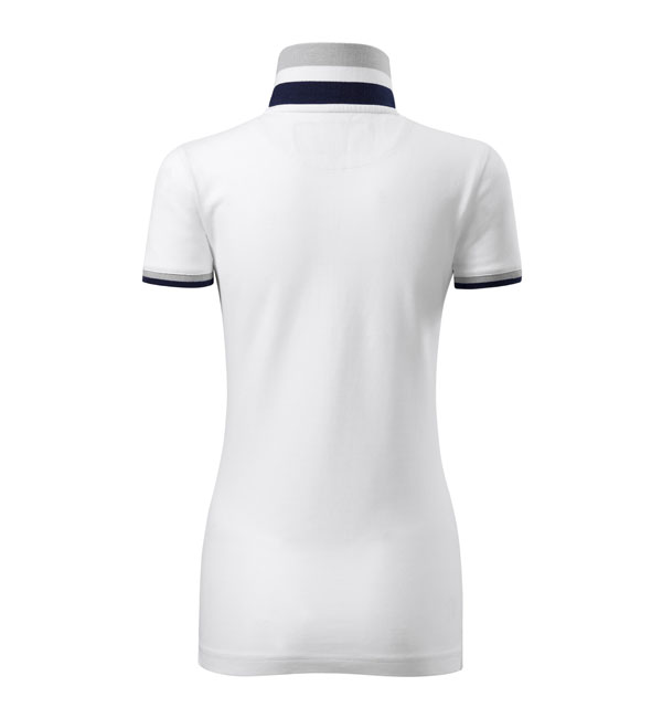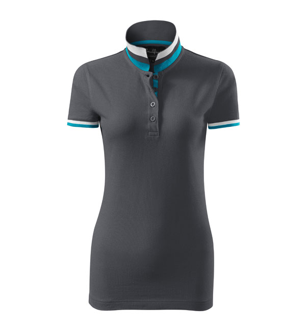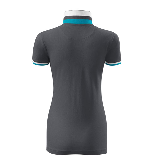 Modna damska koszulka polo z krótkim rękawem ozdobiona detalami w kontrastowym kolorze. Kołnierzyk i rękawy uszyte z dzianin ściągaczowej 1:1. Taśma wokół szyi w kontrastowym kolorze. Kołnierzyk zapinany na 2 guziki ozdobione logiem Malfini. Strona wewnętrzna kołnierzyka przeszyta taśmą w kontrastowym kolorze. Rozcięcia w bocznych szwach wzmocnione taśmą w kontrastowym kolorze.