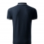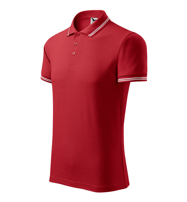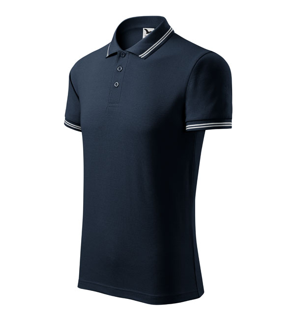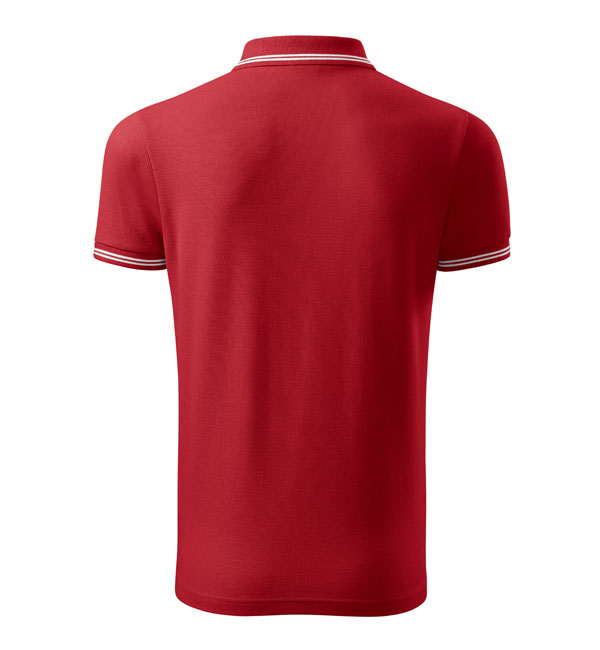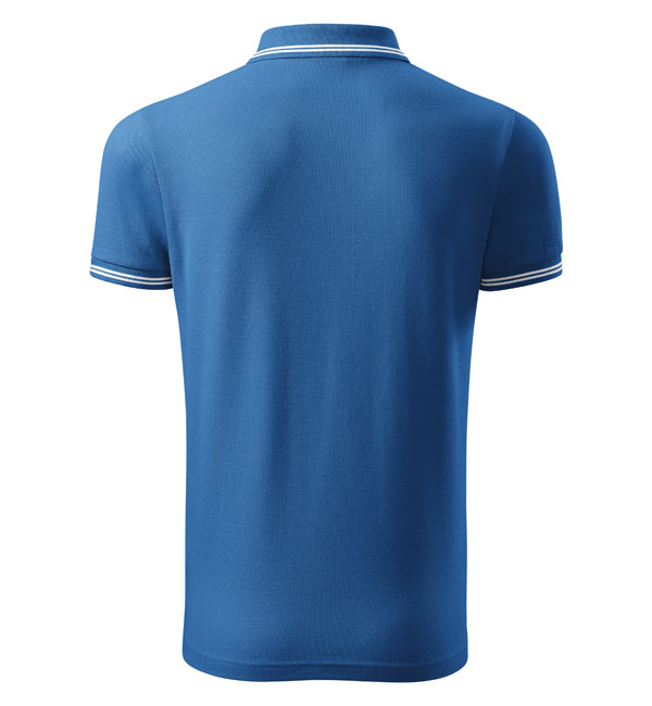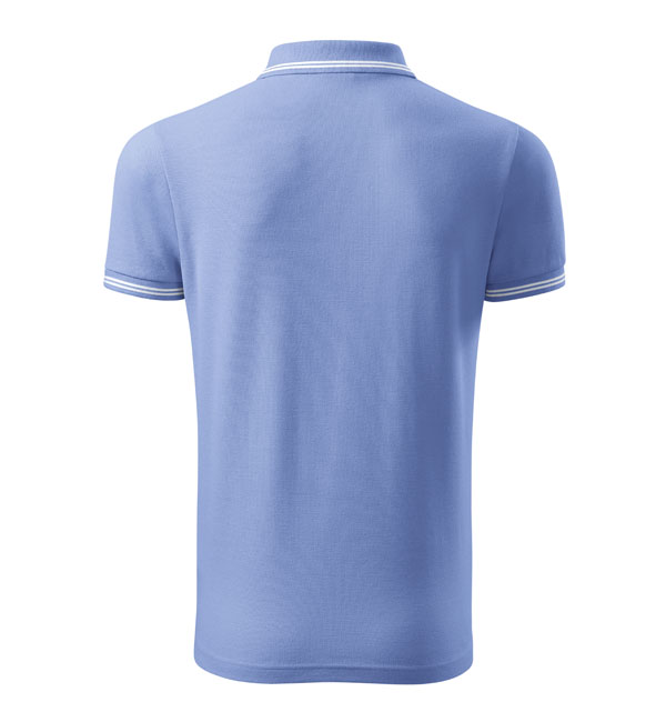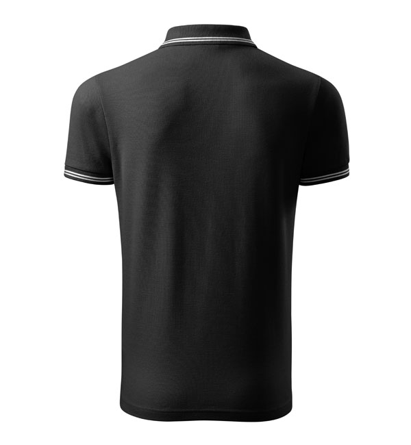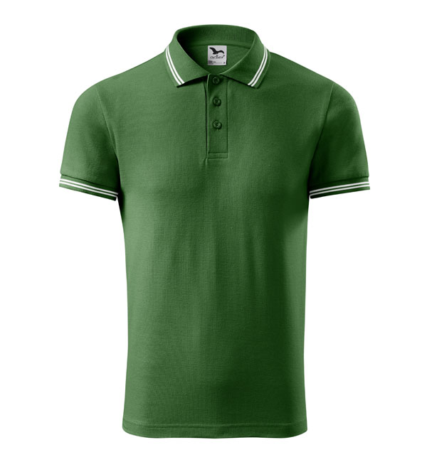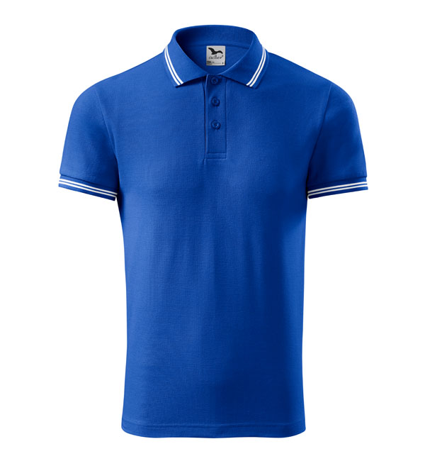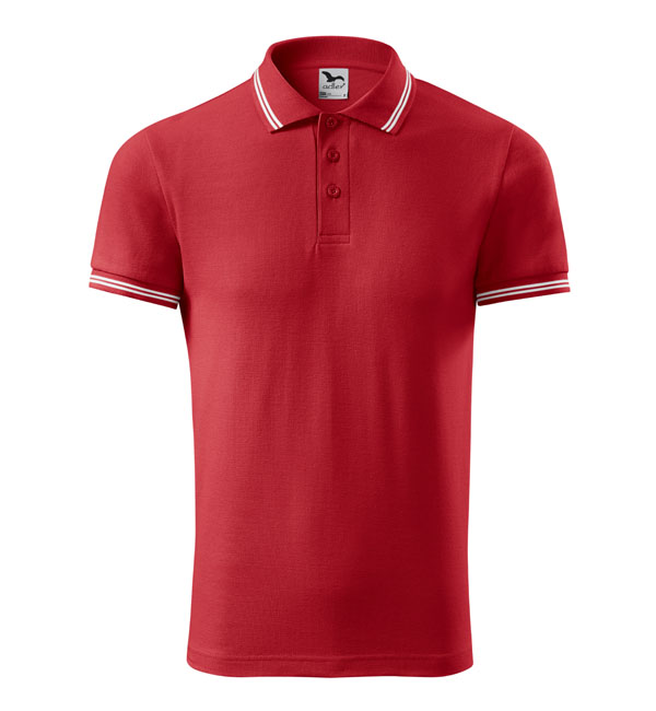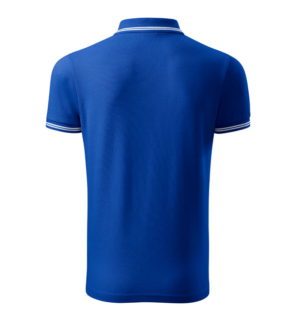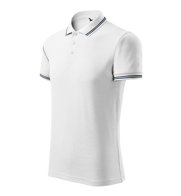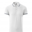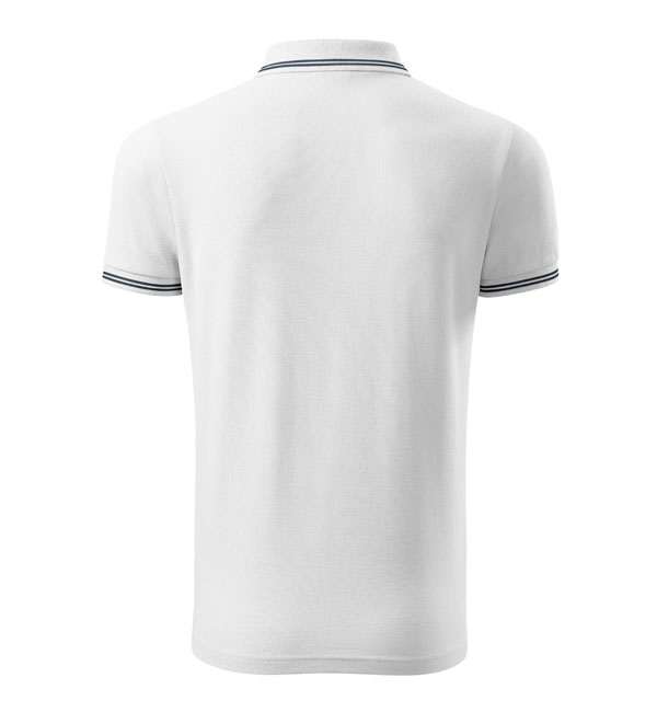 Męska koszulka polo wysokiej jakości. Podwójny ozdobny pasek w kontrastowym kolorze umieszczony na kołnierzyku i rękawach (produkt w białym kolorze z paskami w barwie - 02). Kołnierzyk oraz rękawy uszyte z dzianiny ściągaczowej 1:1. Kołnierzyk zapinany na 3 guziki w kolorze materiału. Taśma wokół szyi w kolorze koszulki polo. Krój z bocznymi szwami. Taśma wzmacniająca na ramionach.