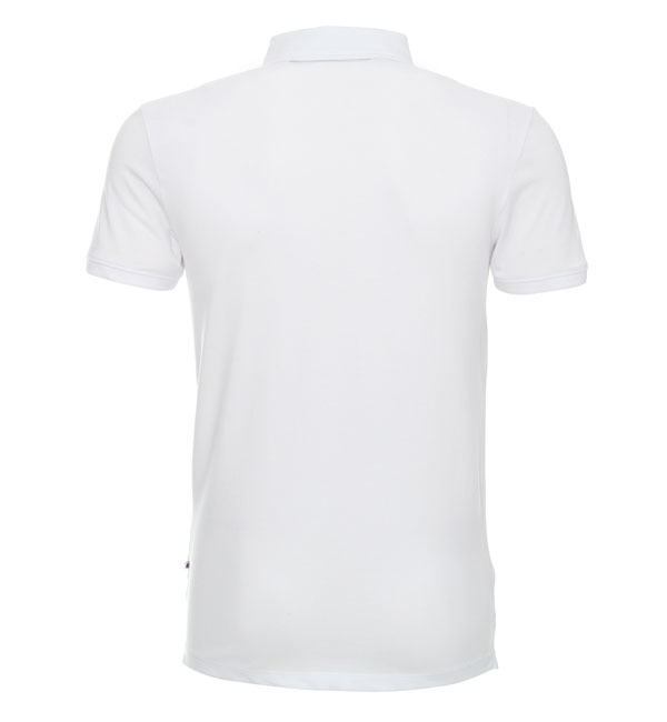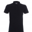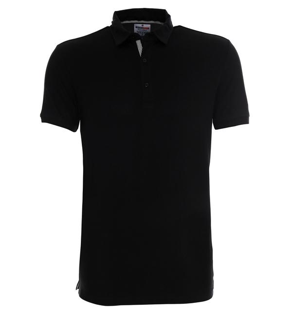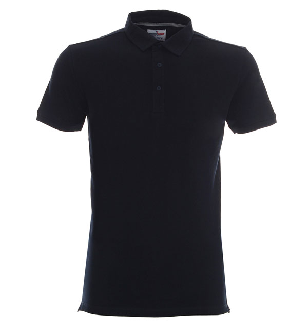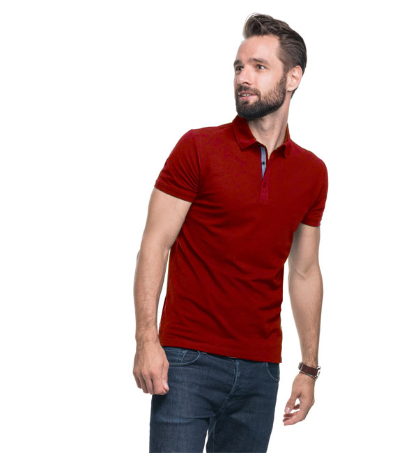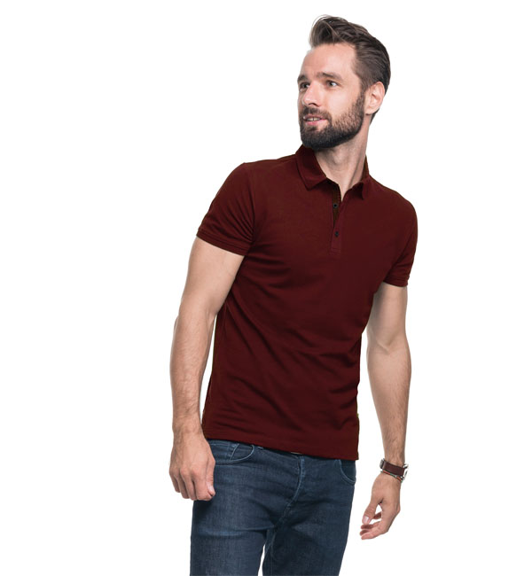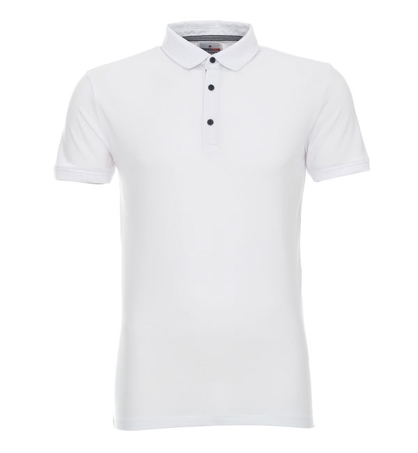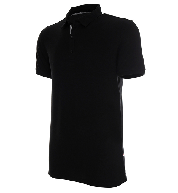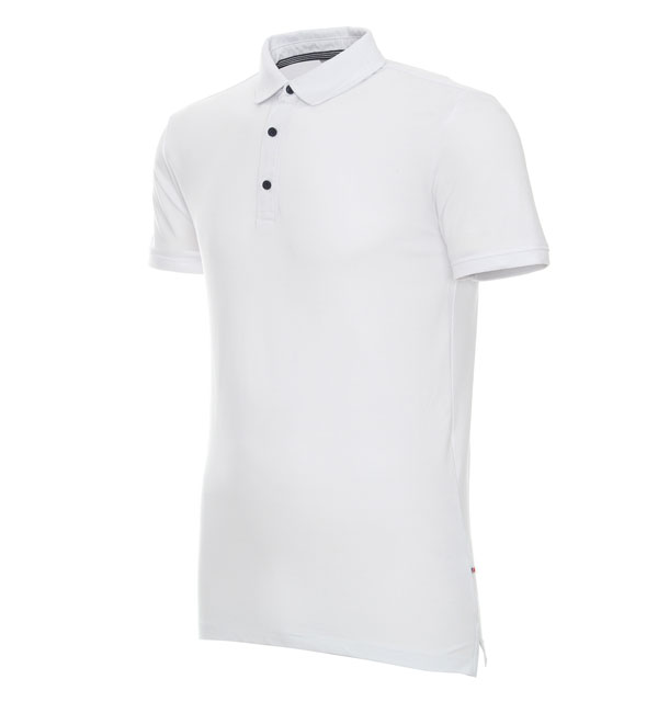 Dzianina typu pique; kołnierz ze stójką; taśma kontrastowa wewnątrz kołnierzyka; 3 guziki; podwójne szwy; rozcięcia na bokach.