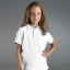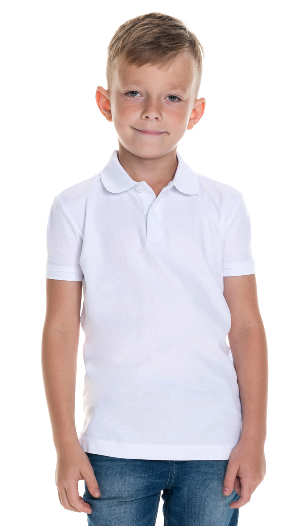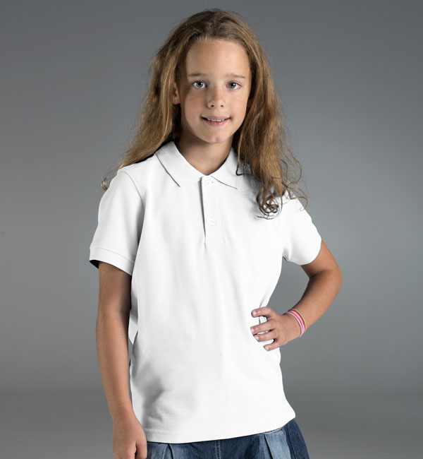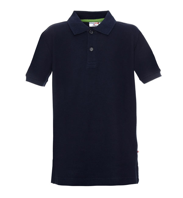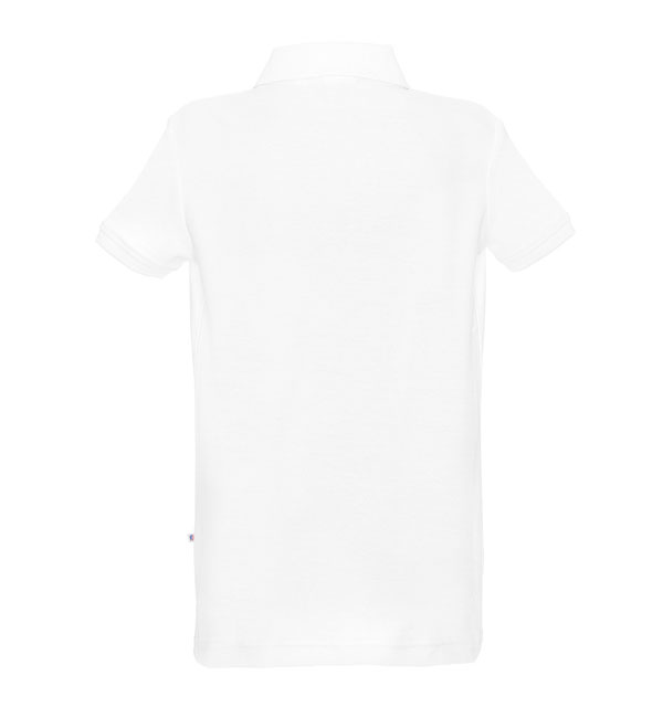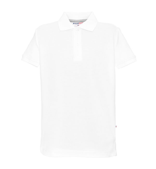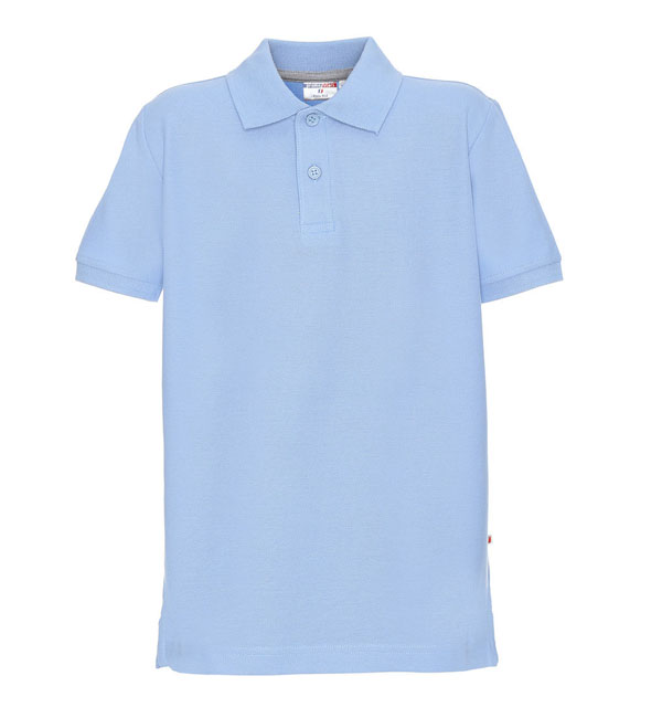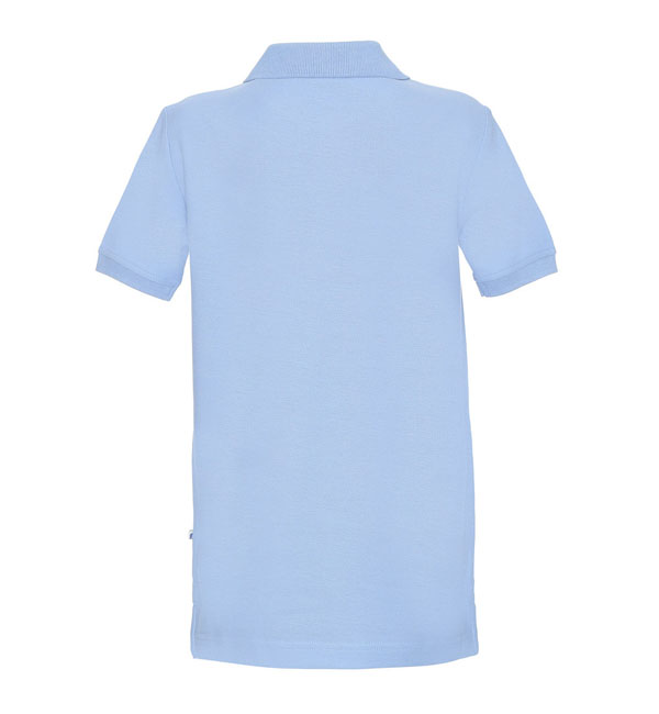 Płaski kołnierz; dzianina typu pique; dwa guziki; rozcięcie na bokach; podwójne szwy.