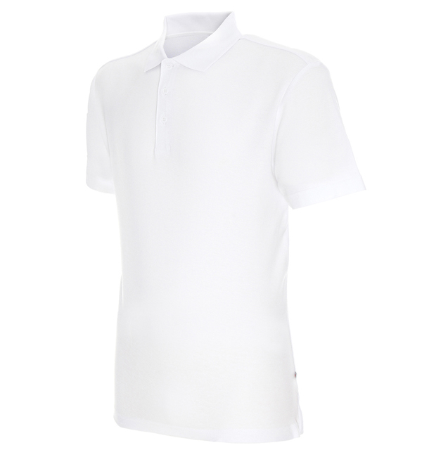 Płaski kołnierz; dzianina typu pique; trzy guziki; rozcięcie na bokach; podwójne szwy.