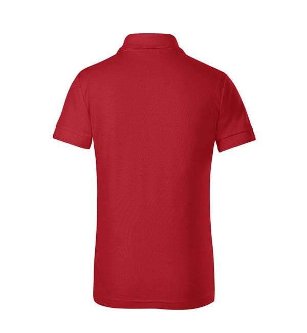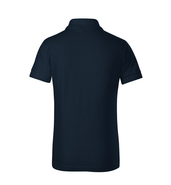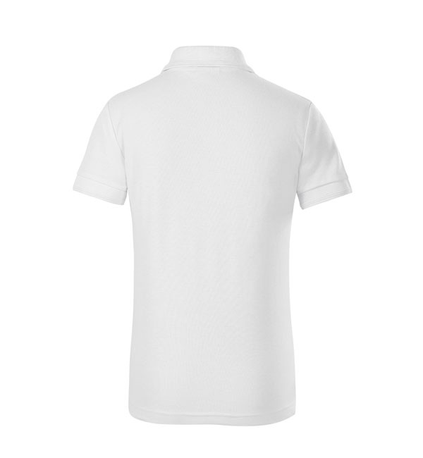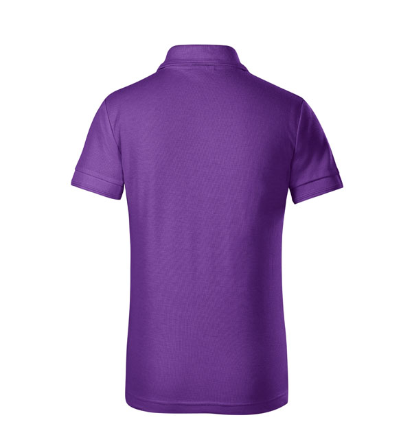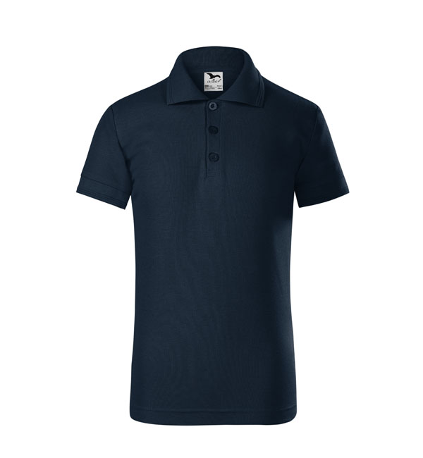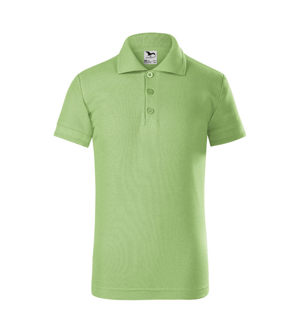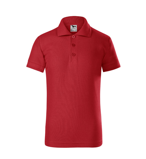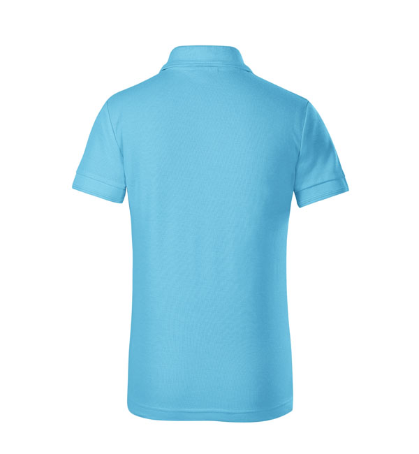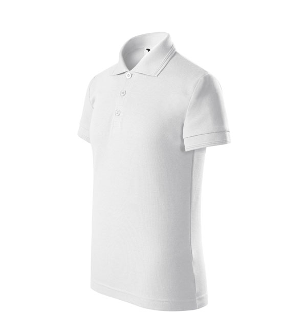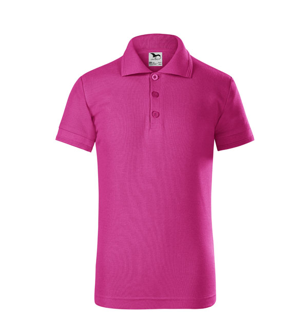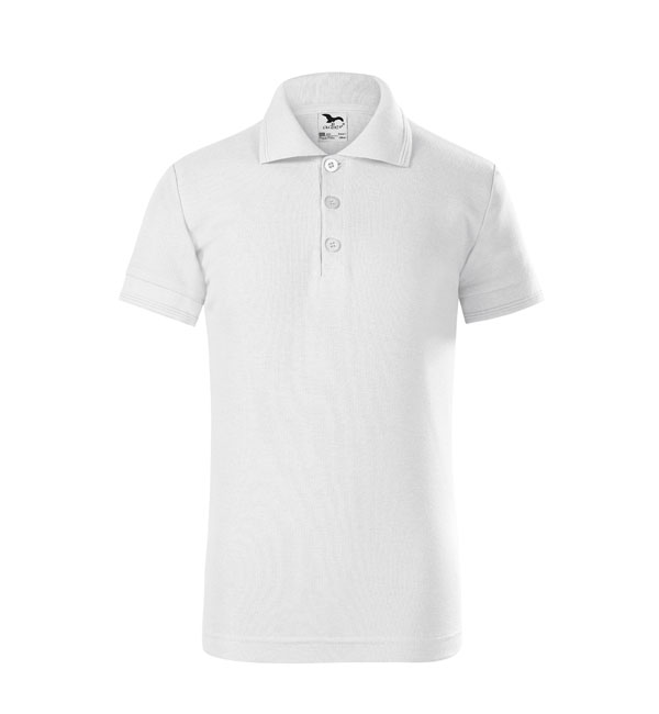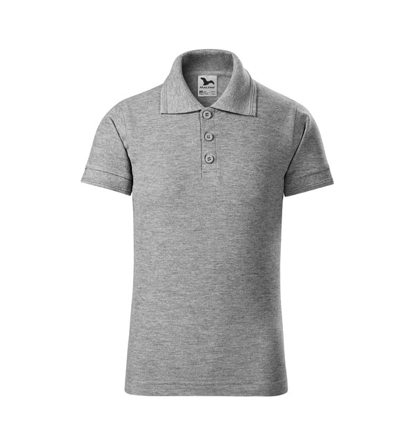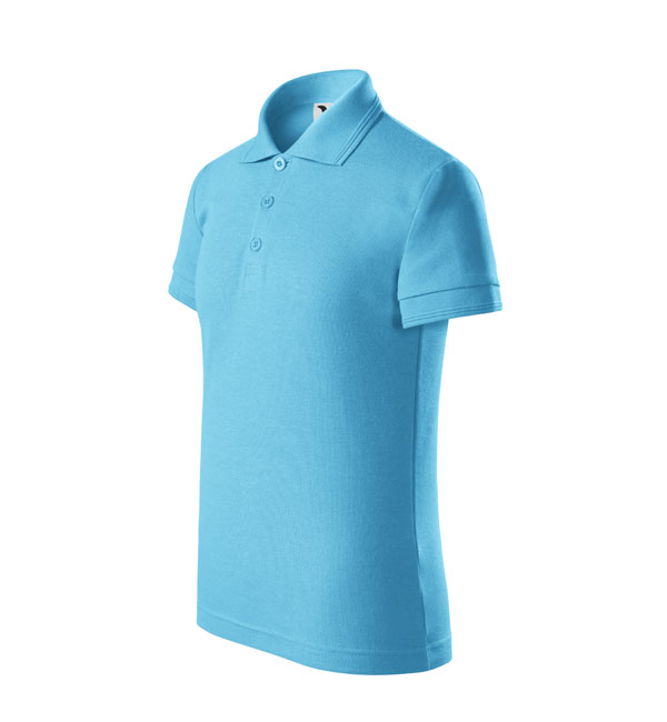 Dziecięca koszulka polo o wyższej gramaturze. Kołnierzyk i wykończenie rękawów ze splotu żeberkowego z podwójnym zdobieniem. 3 guziczki w kolorze materiału, lużny krój z bocznymi szwami.