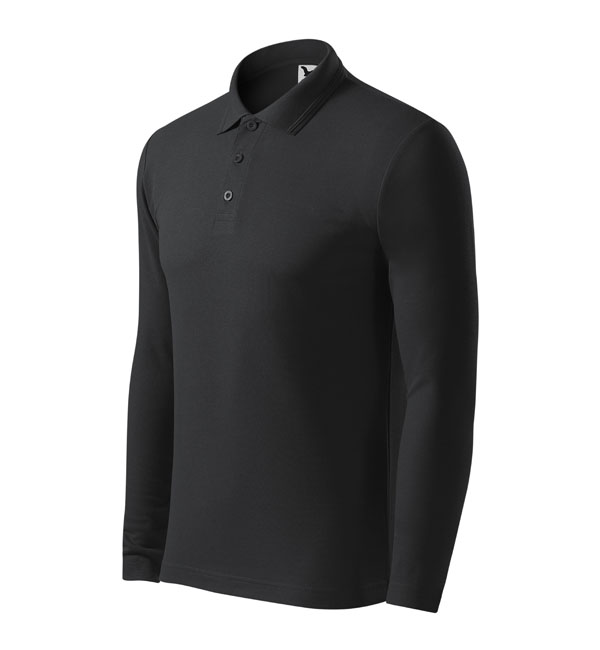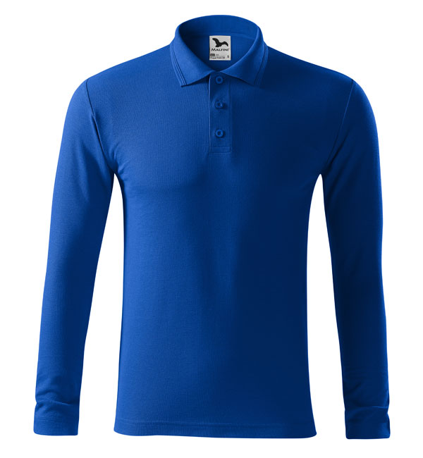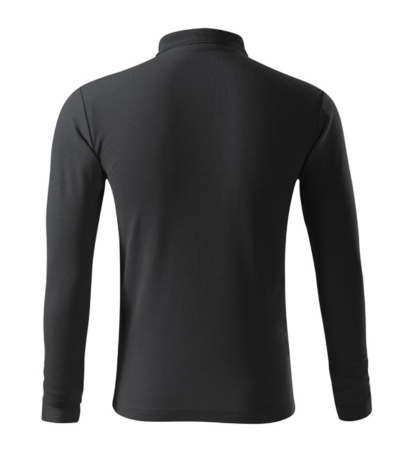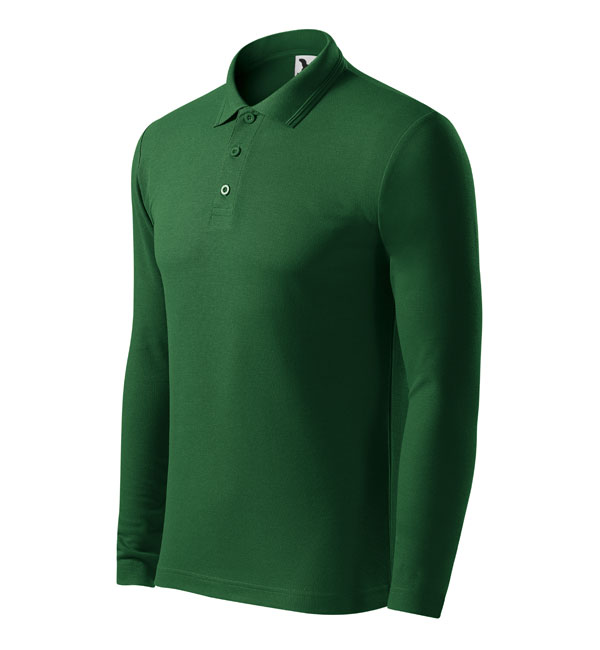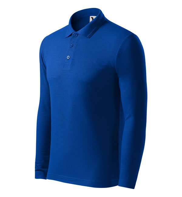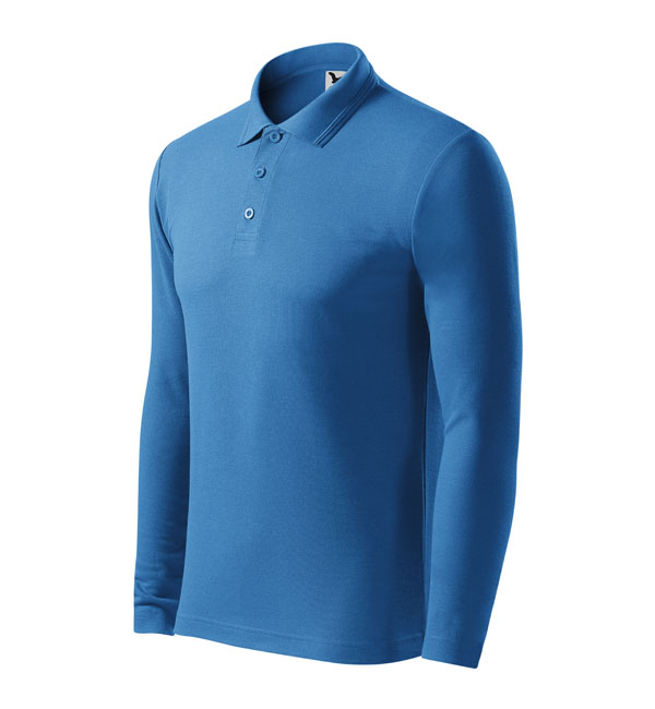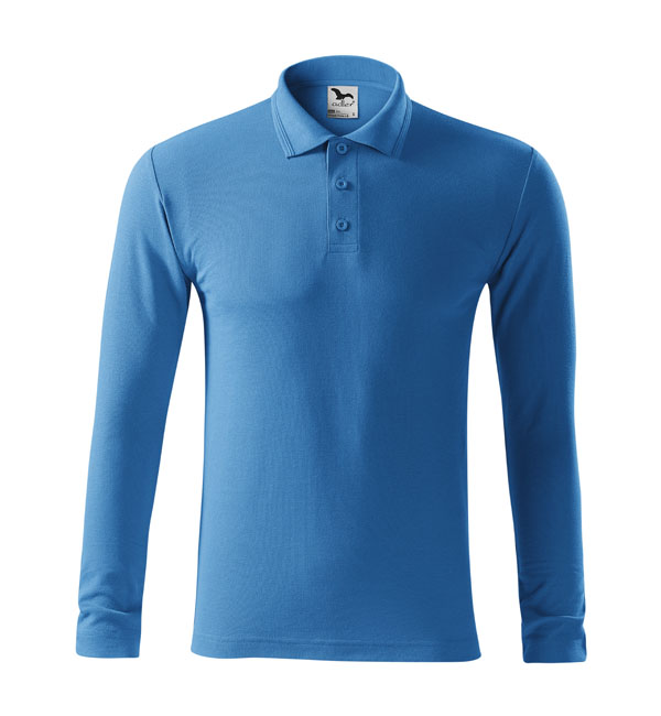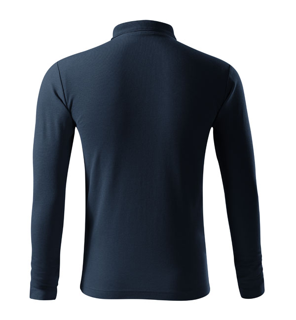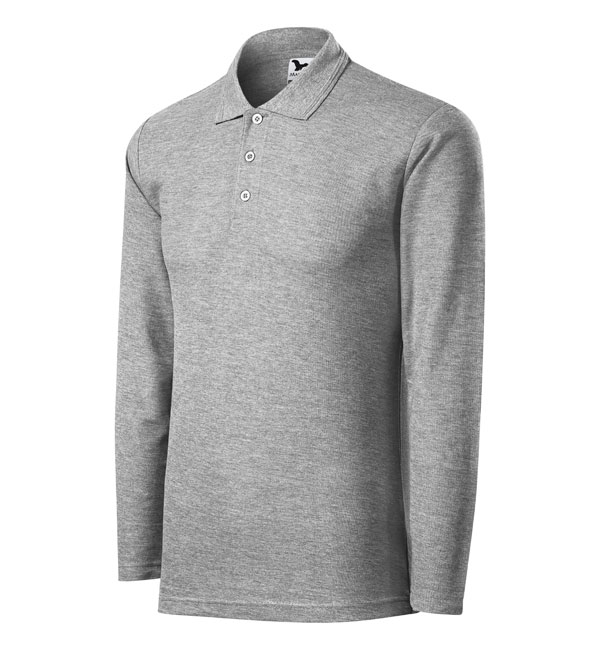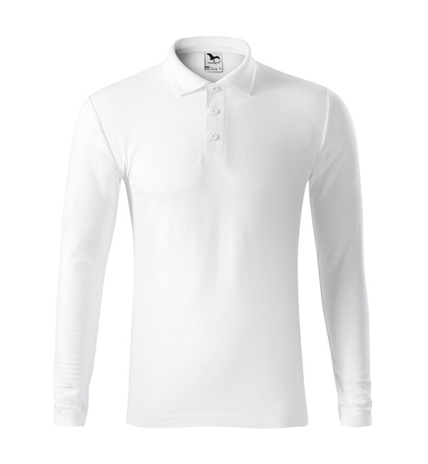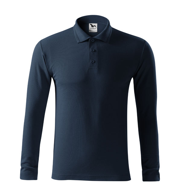 Koszulka polo z długim rękawem o wyższej gramaturze. Kołniezyk ze splotu żebrowanego 1:1 z podwójną ozdobną wypustką. Wewnętrzna część kołnierzyka wzmocniona taśmą w kolorze materiału. Trzy guziki w kolorze materiału. Rękawy wykończone podwójnym szwem. Krój z bocznymi szwami.