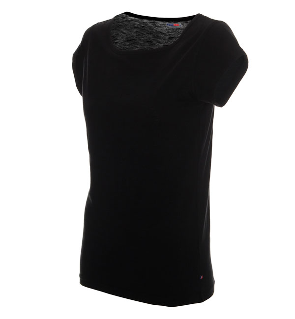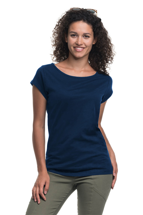 Miękki i gładki materiał single jersey typu slub; kołnierz wykończony lamówką, dekoracyjne przeszycia na rękawach.