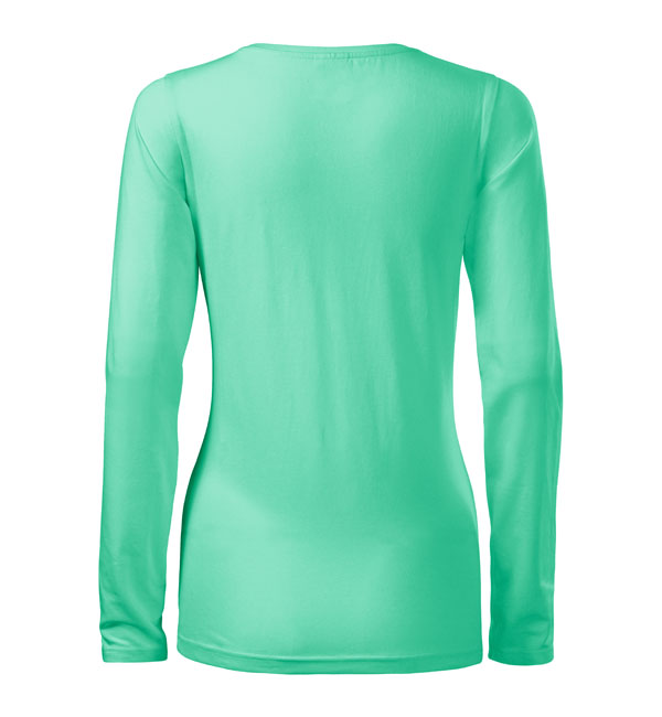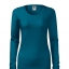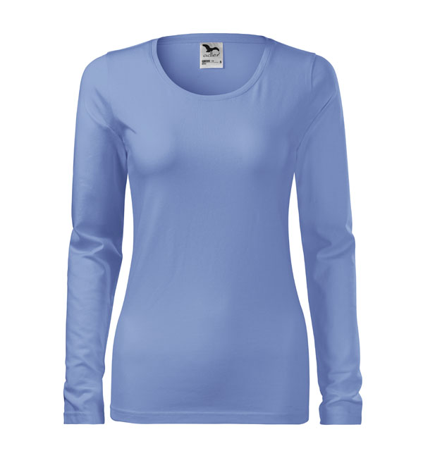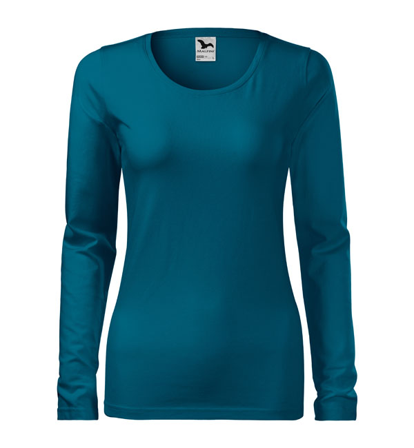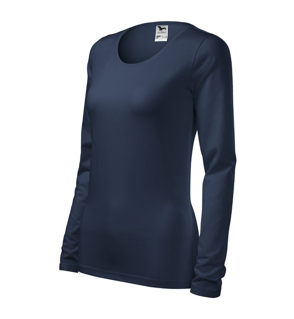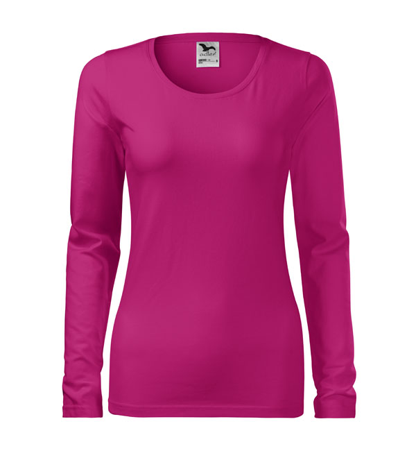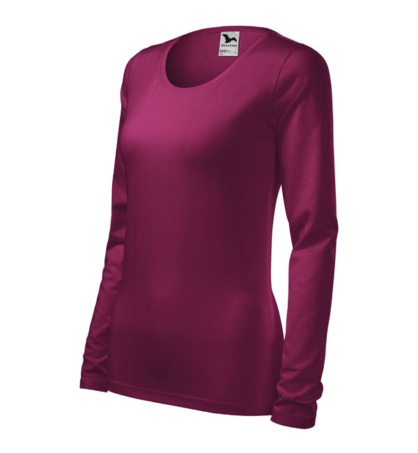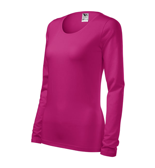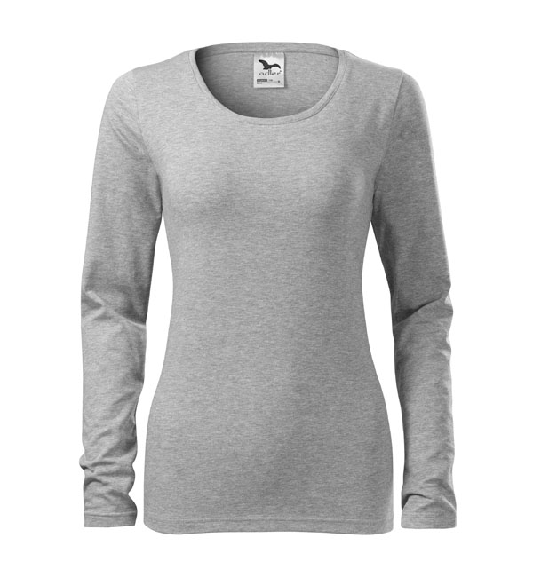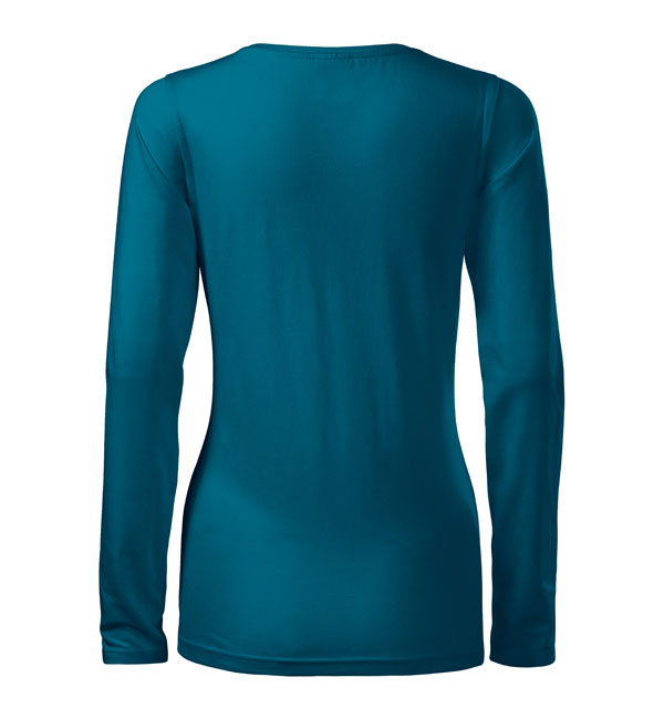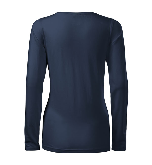 Koszulka damska z długim rękawem; materiał z dodatkiem elastanu; dopasowany krój z bocznymi szwami podkresla kobiecą sylwetke; okrągły dekolt z wąskim obszyciem z tego samego materiału.