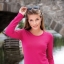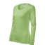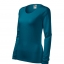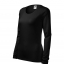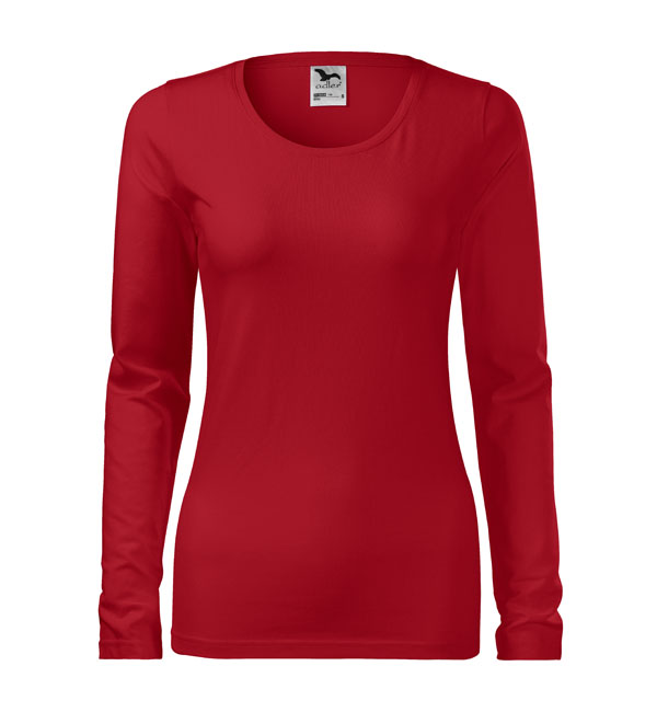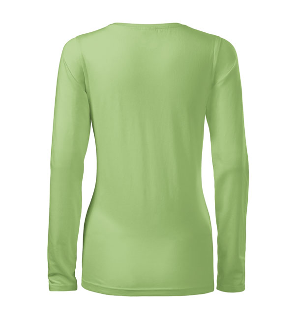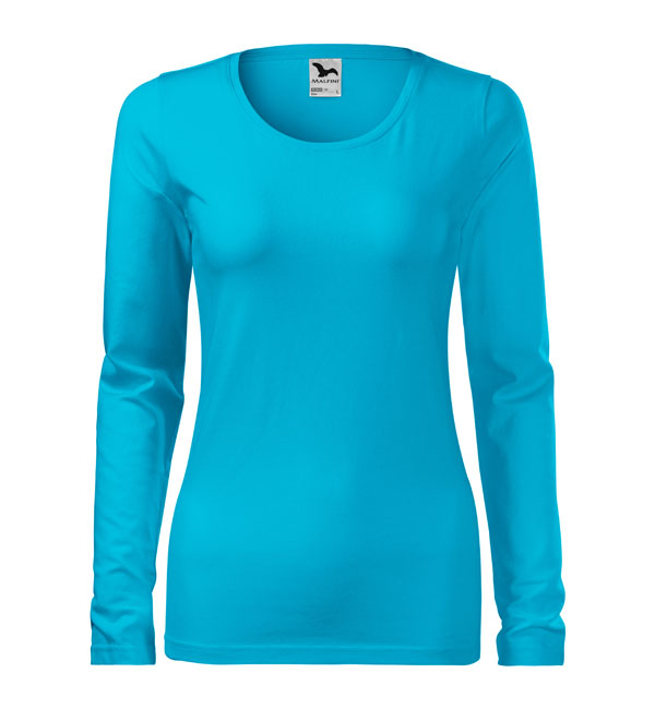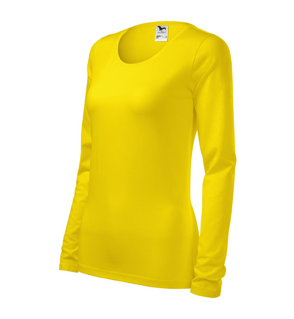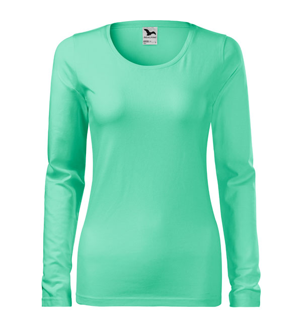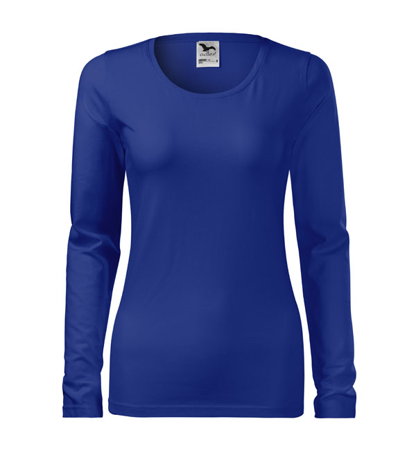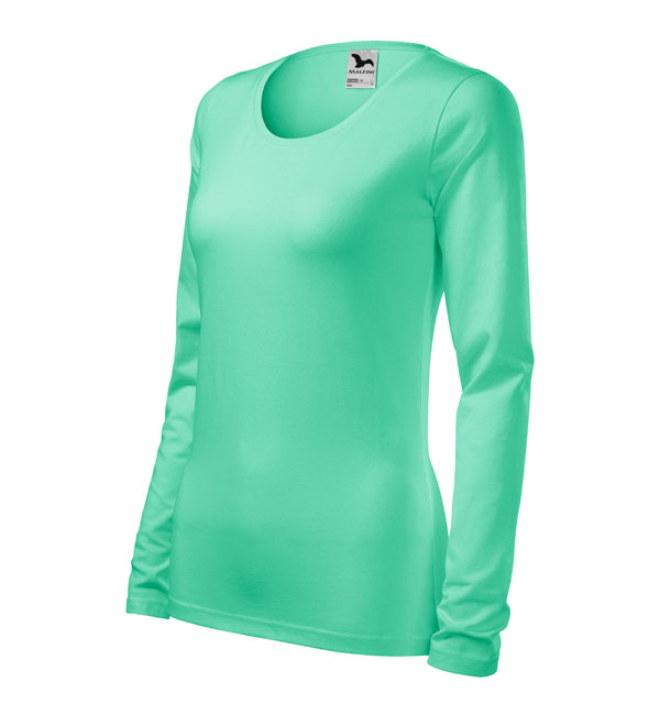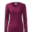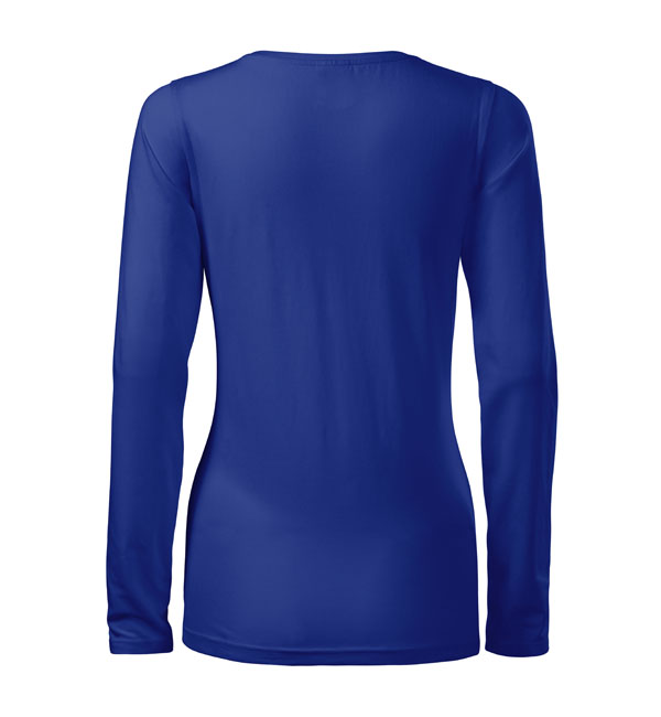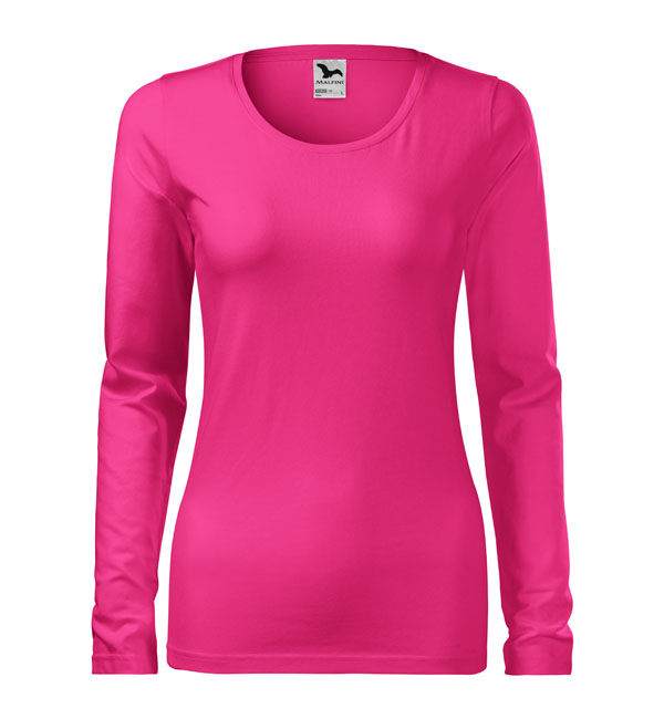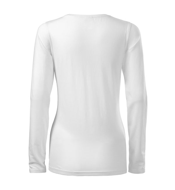 Koszulka damska z długim rękawem; materiał z dodatkiem elastanu; dopasowany krój z bocznymi szwami podkresla kobiecą sylwetke; okrągły dekolt z wąskim obszyciem z tego samego materiału.