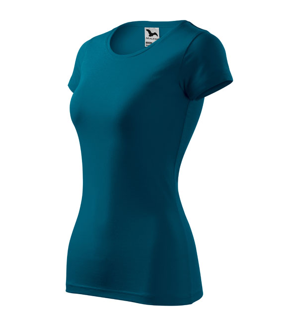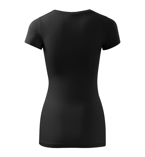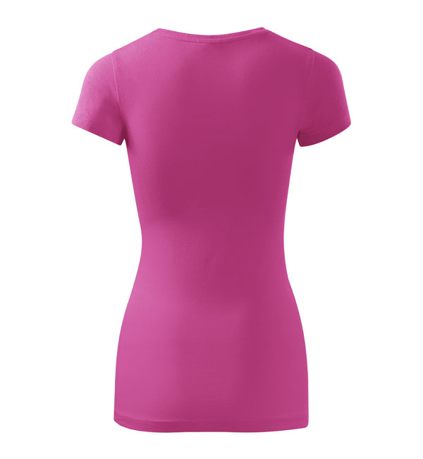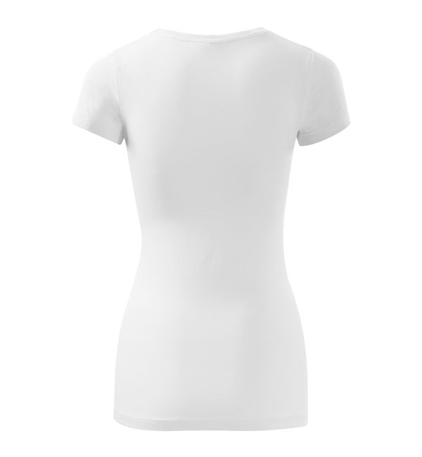 Koszulka damska z okrągłym dekoltem; materiał z dodatkiem elastanu; dopasowany krój z bocznymi szwami podkreslający kobiecą sylwetke; dekolt z wąską lamówką z tego samego materiału.