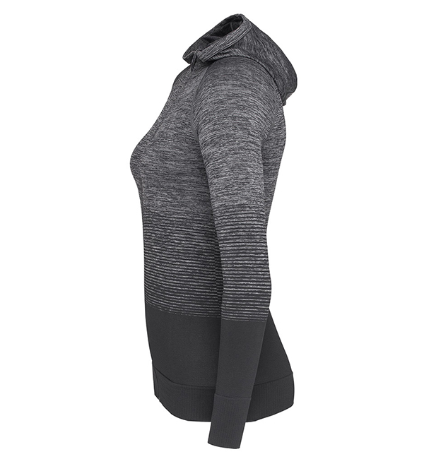 Szybko schnąca damska kurtka sportowa z kapturem i raglanowymi rękawami. Wieloczęściowy kaptur nurkowy, otwory na kciuk, niezwykle wysoka elastyczność i wielobarwna gradacja kolorów.