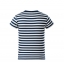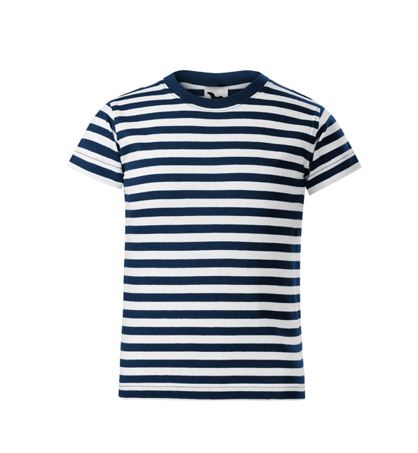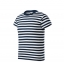 Koszulka wysokiej jakości w paski biało-granatowe. Kołnierzyk z dzianiny ściągaczowej z dodatkiem 5 % elastanu. Taśma wzmacniająca wokół szyi. Ramiona wzmocnione taśmą w kolorze koszulki. Dopasowany krój z bocznymi szwami. Bardzo krótkie rękawy.
