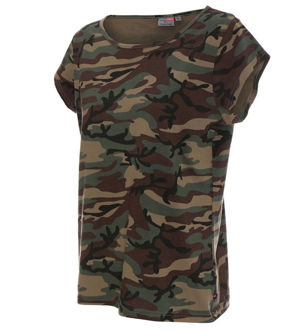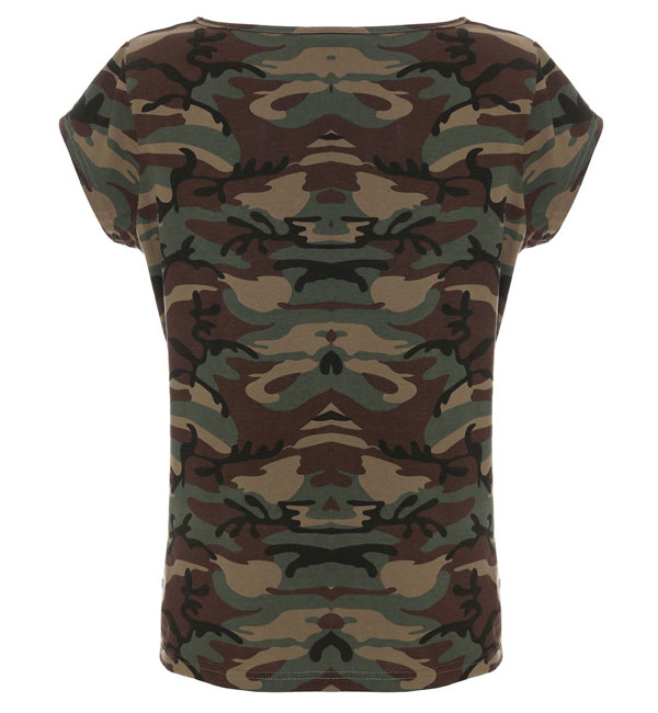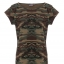 Miękki i gładki materiał z nadrukowanym wzorem moro; dekolt wykończony lamówką, taśma wzmacniająca na ramionach; podwójne szwy.