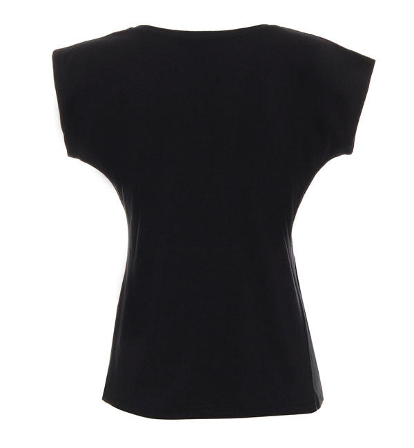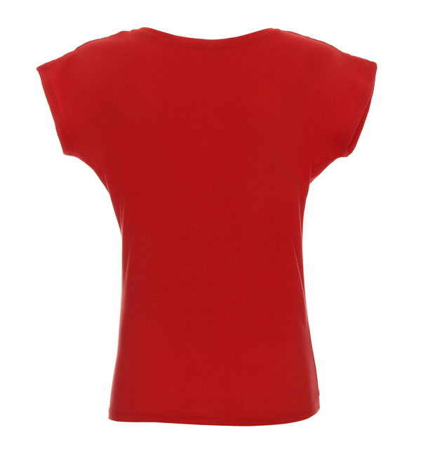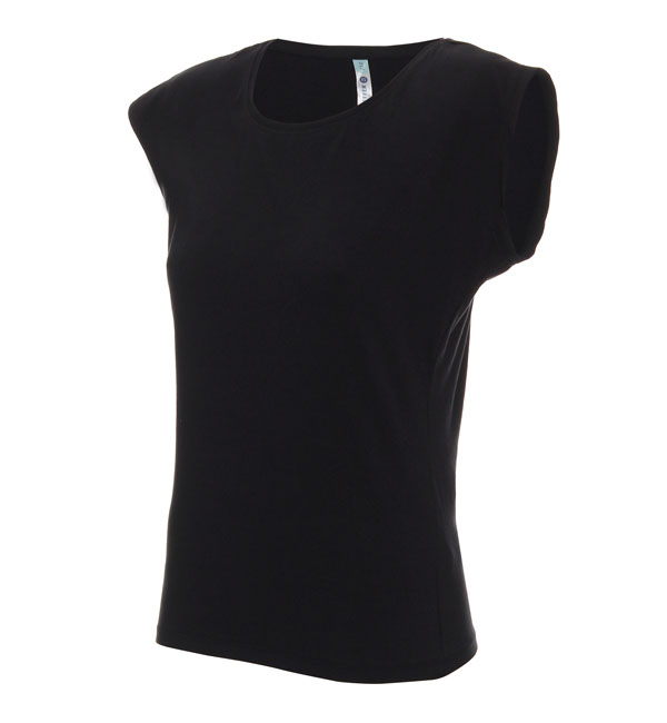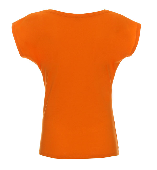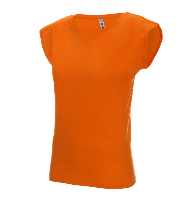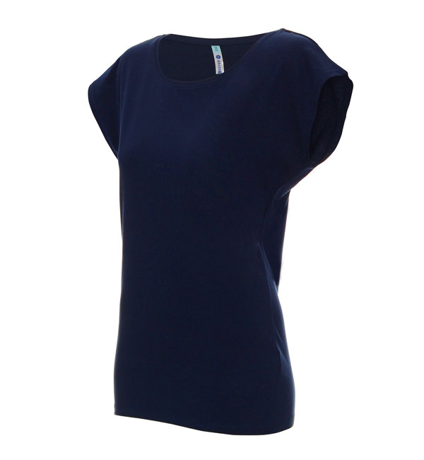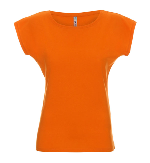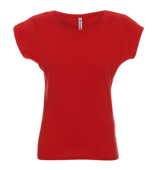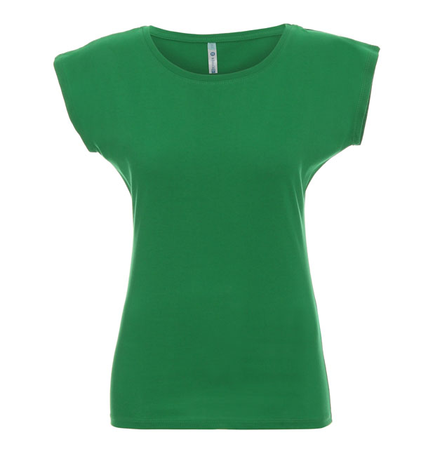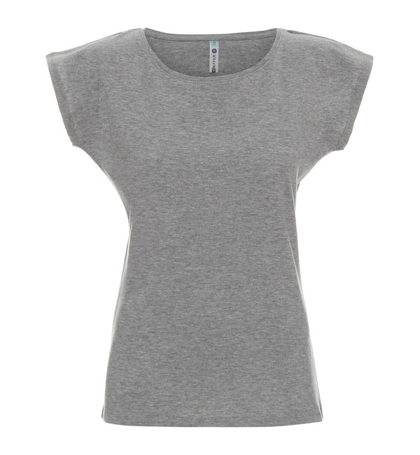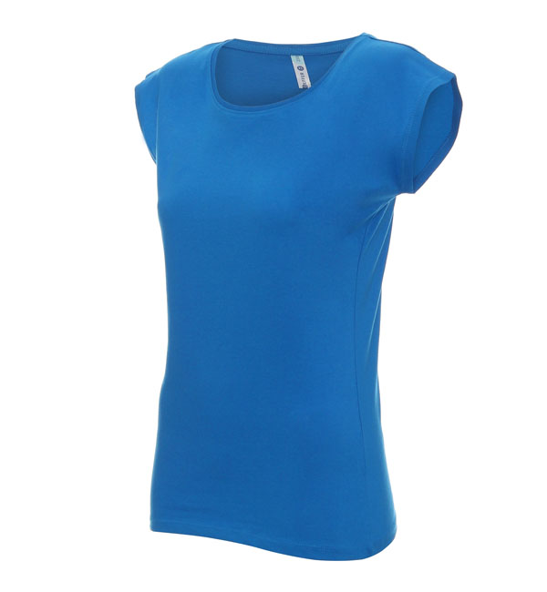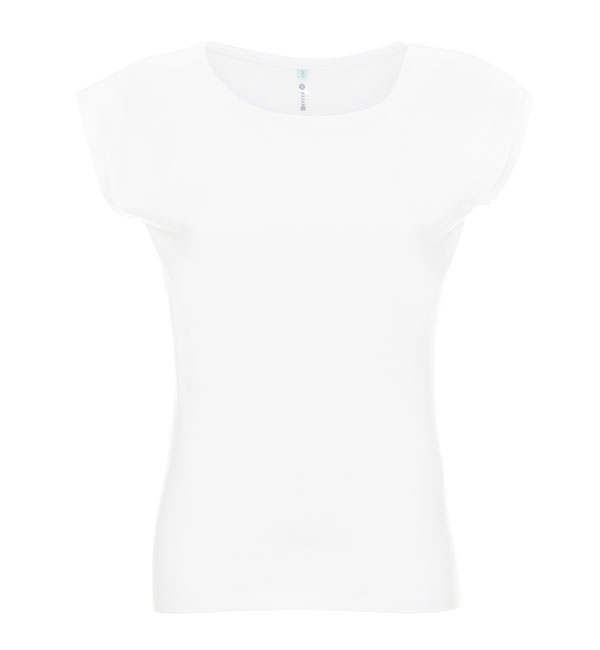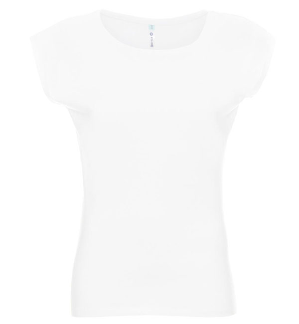 T-shirt damski z dzianiny single jersey; bawełniany ściagacz; boczne szwy; podwójne szwy.