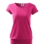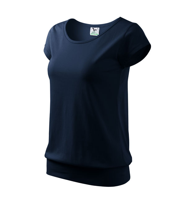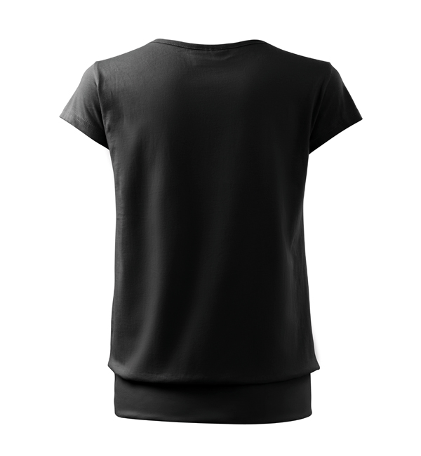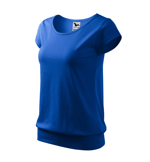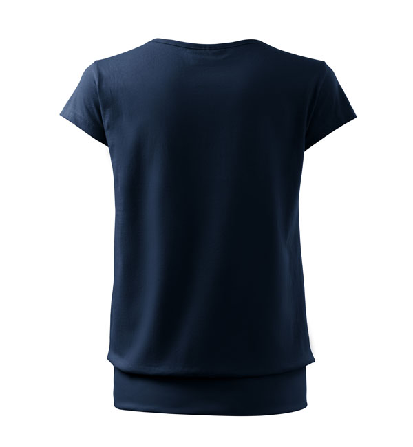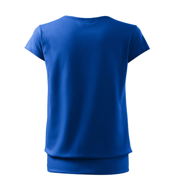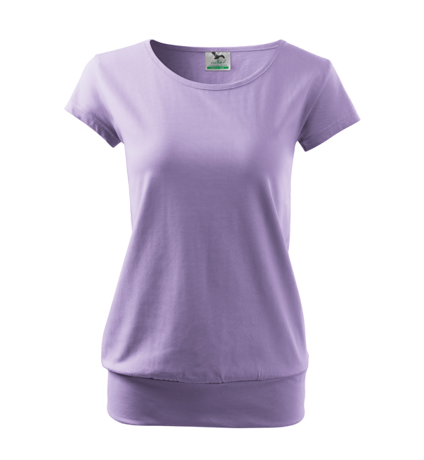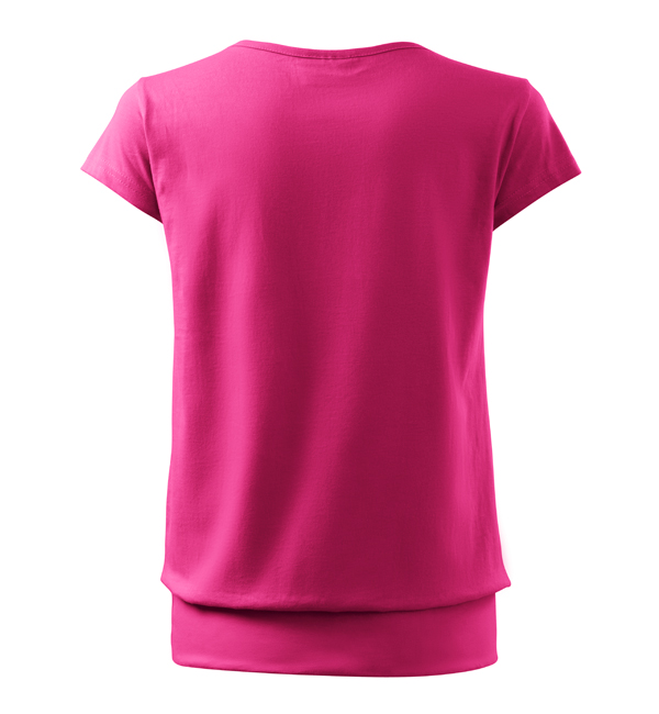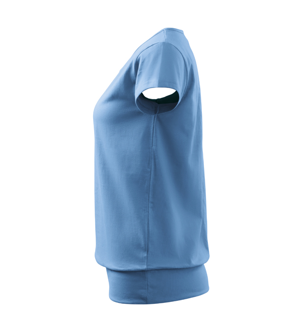Modna koszulka damska z bardzo krótkim rękawkiem, krój niekrępujący ruchów, dolne brzegi wszyte w szerokie lamówki. Okrągłe wycięcie z wąską lamówką z tego samego materiału. Ramiona wzmocnione dzięki wszytym paskom. Długość koszulki – do bioder. Dzięki preparatowi zmiękczającemu tkanina jest delikatna i miękka w dotyku. Produkt doskonały pod haft i nadruk.