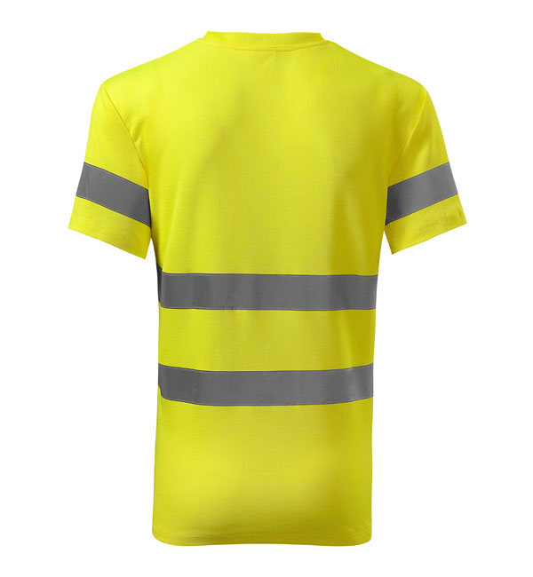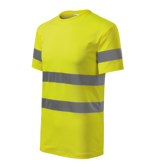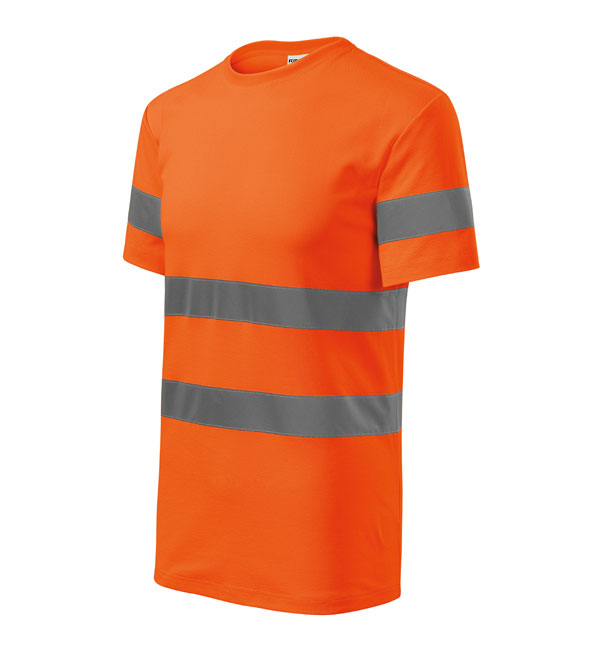 Koszulka unisex w kolorze fluoroscencyjnym z rekawai o kulisty kształt; okrągły dekolt z dzianiny ściągaczowej 1:1; krój z bocznymi szwami; naszyte certyfikowane taśmy odblaskowe 3M.