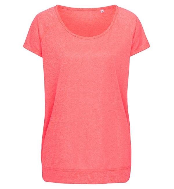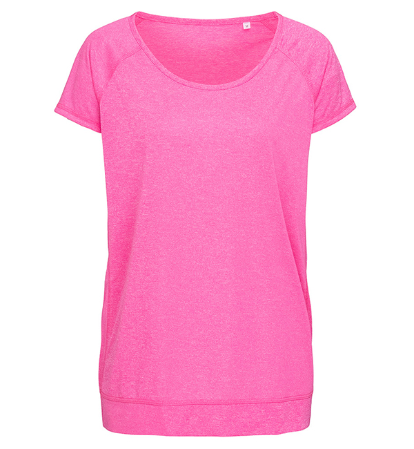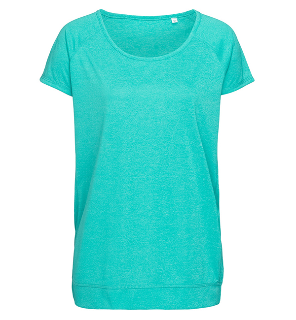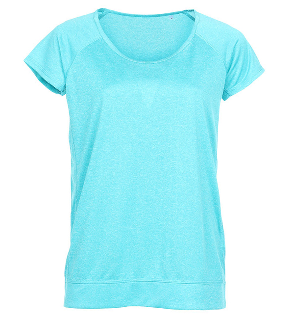 Nowoczesne sportowe T-shirty dla kobiet, z raglanowymi rękawami, wykonane z szybkoschnącego poliestru z efektem melanżu, zapewniają pełną swobodę ruchu.