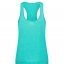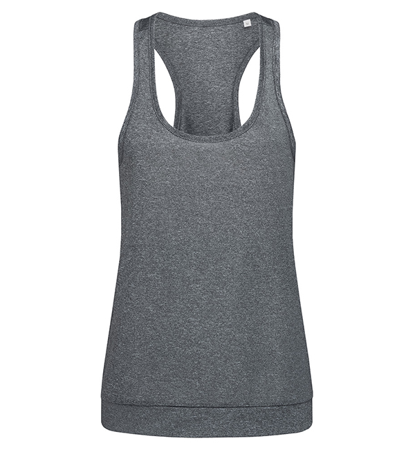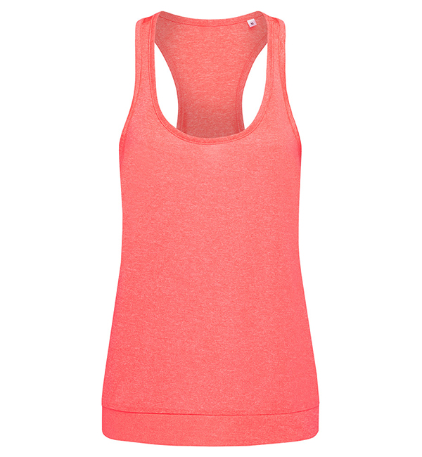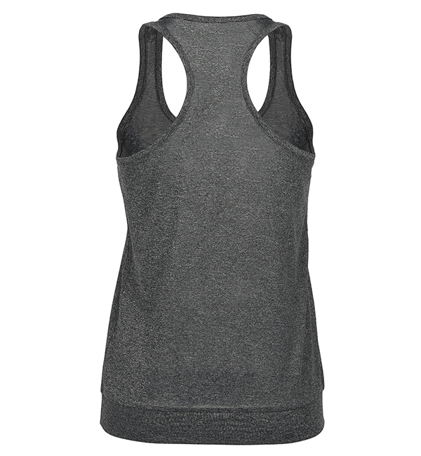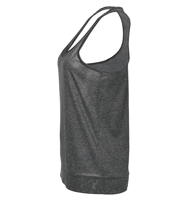 Nowoczesne sportowe topy dla kobiet, z wycięciem na plecach i obrębionymi ramionami, wykonane z szybkoschnącego poliestru z efektem melanżu, zapewniają pełną swobodę ruchu.