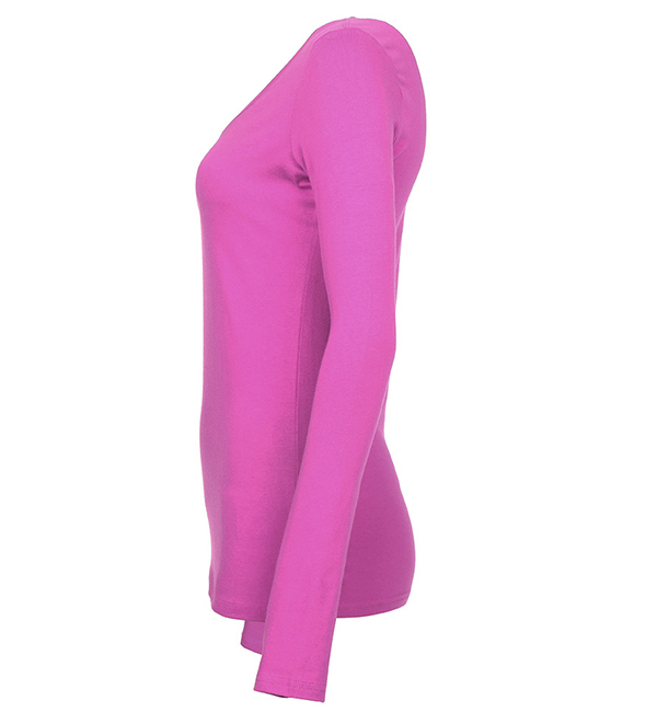 Dopasowany T-shirt z długimi rękawami dla kobiet, o modnej długości, wykonany z miękkiej i połyskliwej mieszanki bawełny i elastanu, z trójkątnym dekoltem i taśmą w kontrastującym kolorze na karku.
