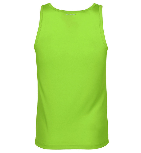 Dekolt i podkrój pach z lamówką, gładka i lekka dzianina, odblaskowe logo ACTIVE-DRY° na plecach, mała metka rozmiarowa na karku, etykietka z przepisem prania w szwie bocznym, szwy boczne