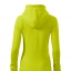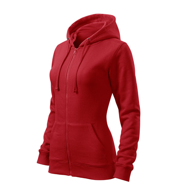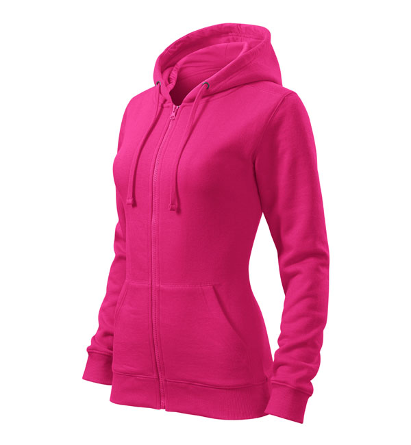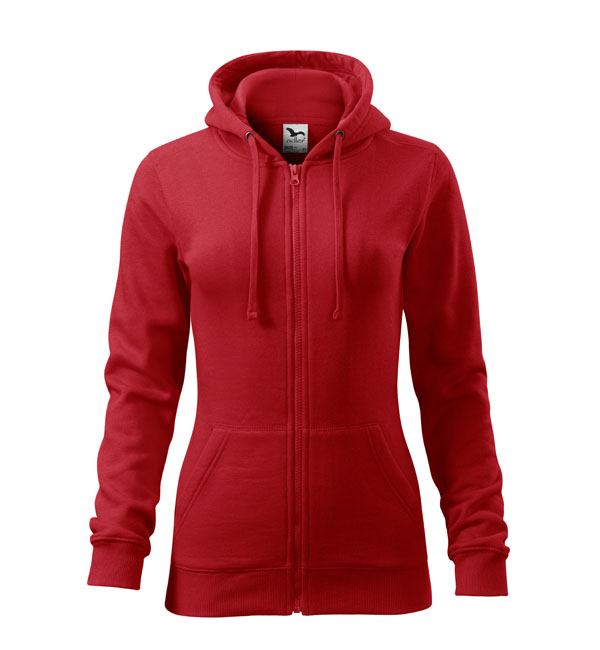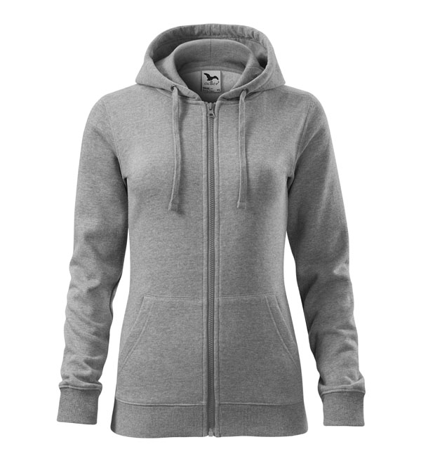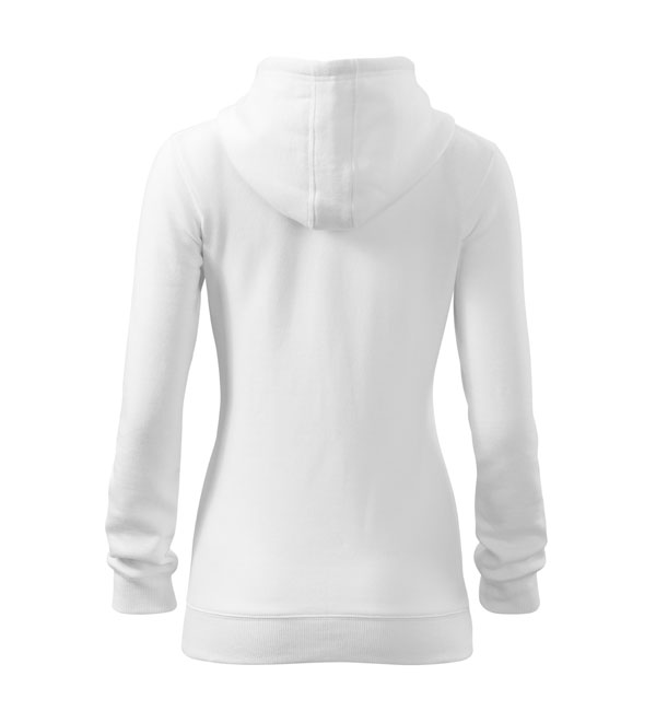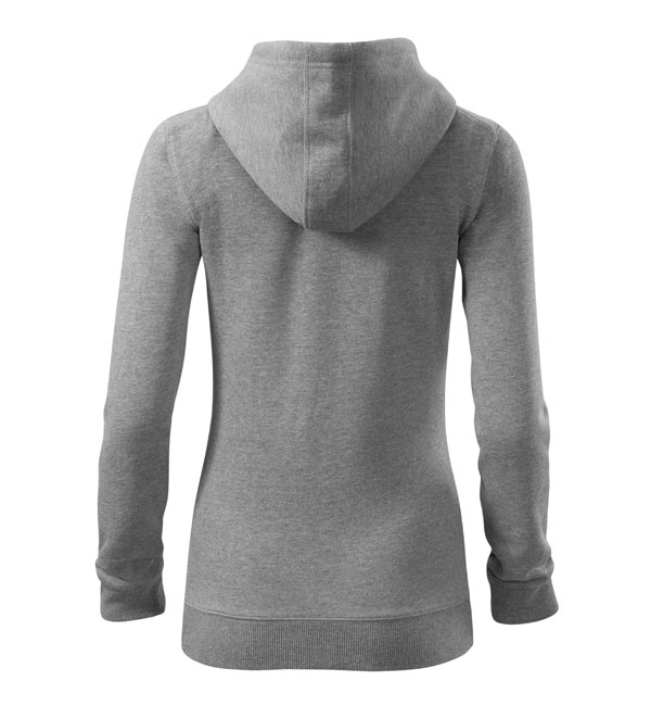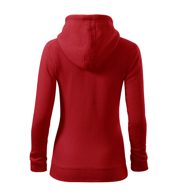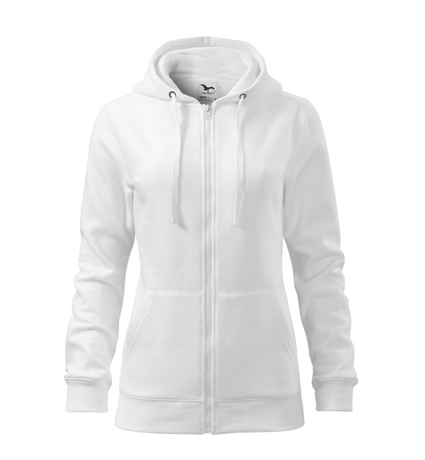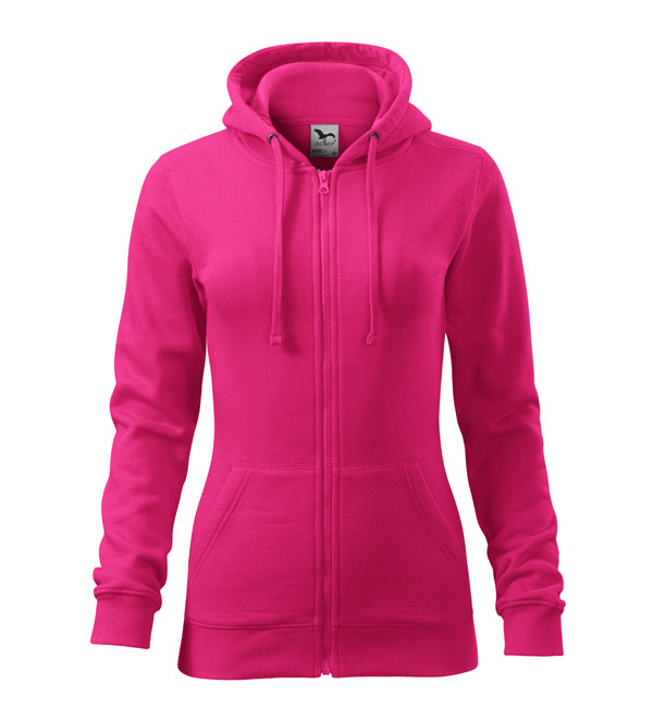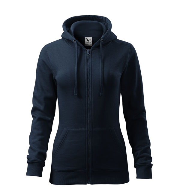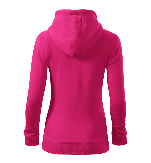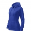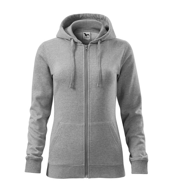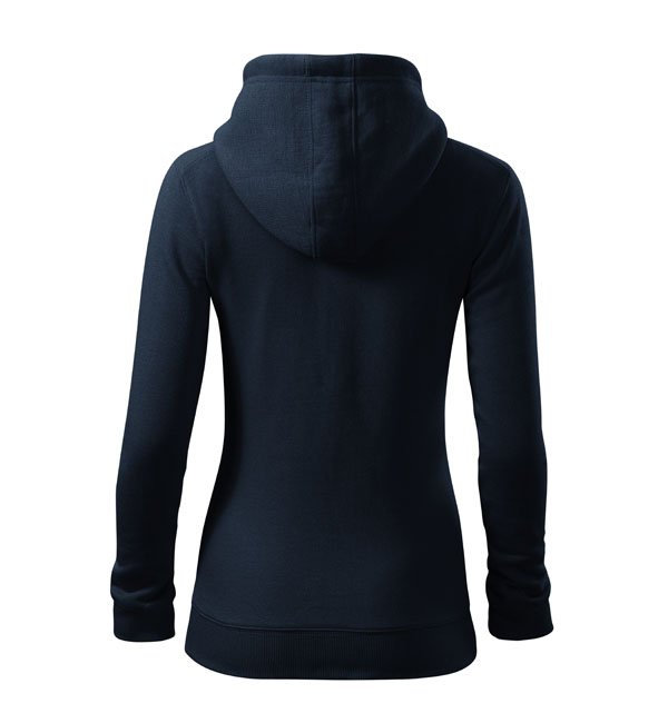 Bluza damska z kapturem zapinana na całej długości na suwak. Przednie dwie kieszenie w stylu kangurka. Regulowany kaptur z podszewką ściągany sznurkiem. Wewnętrzna część wokół szyi wykończona taśmą w kolorze produktu. Krawędzie naramienników i kieszeni wykończone ozdobnym obszyciem. Dół bluzy oraz końcówki rękawów wykończone dzianiną ściągaczową 2-2 z dodatkiem 5 % elastanu. Doskonała pod nadruk i haft.