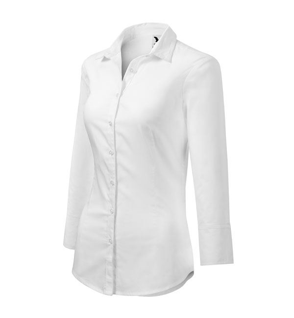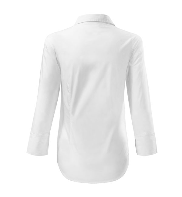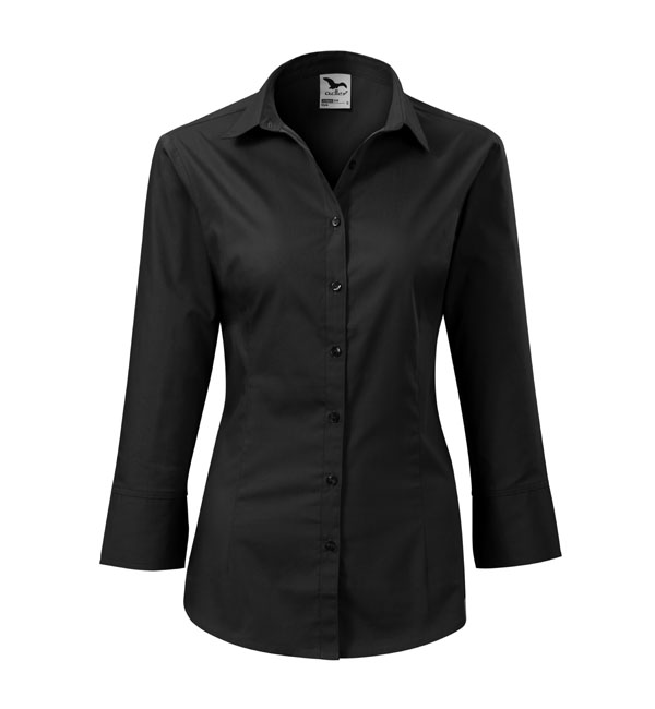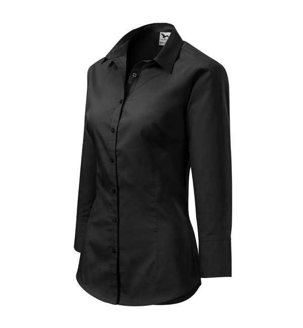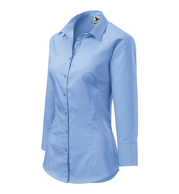 Wysokiej jakości koszula damska z rękawem 3/4. Wycięcie w talii oraz zaszewki na wysokości klatki piersiowej bardzo dobrze podkreślają damską sylwetkę. Kołnierzyk koszulowy. Obszyte przednie brzegi. Zapinana na guziki (dodatkowy guziczek w zestawie). Dolne brzegi rękawów wszyte w wywijane mankiety z ozdobnym rozcięciem,