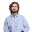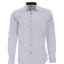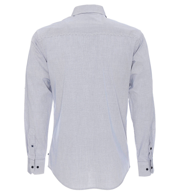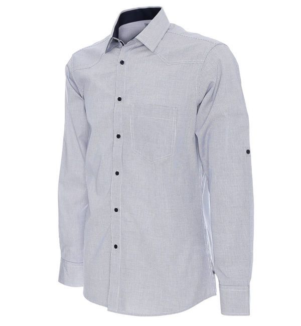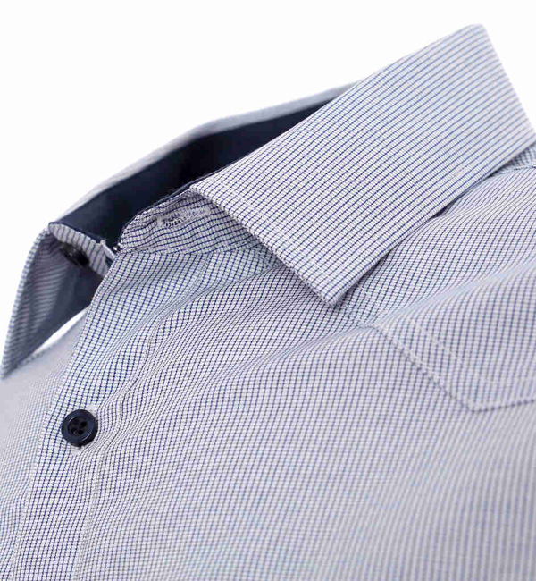 Koszula męska wykonana z materiału w drobną granatową kratkę; tkanina typu easy iron; regulacja długości rękawów; kieszeń na piersi; ozdobne przeszycia.