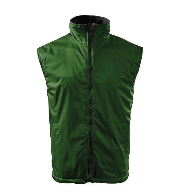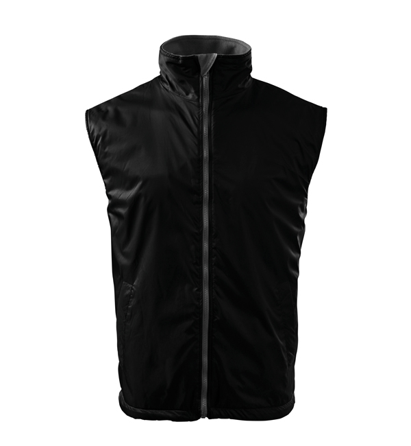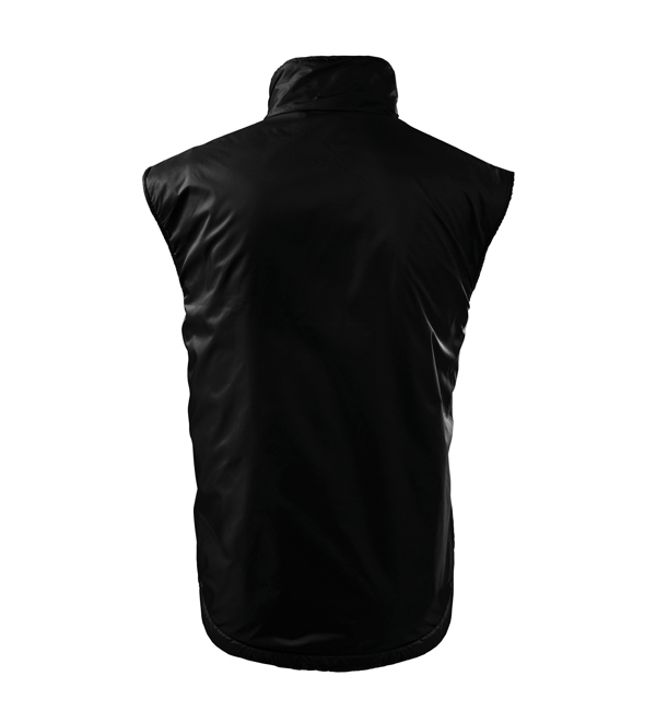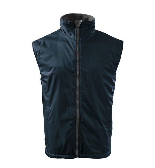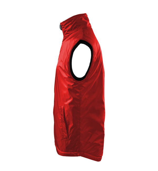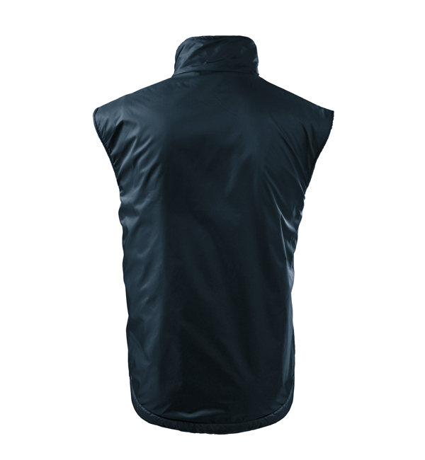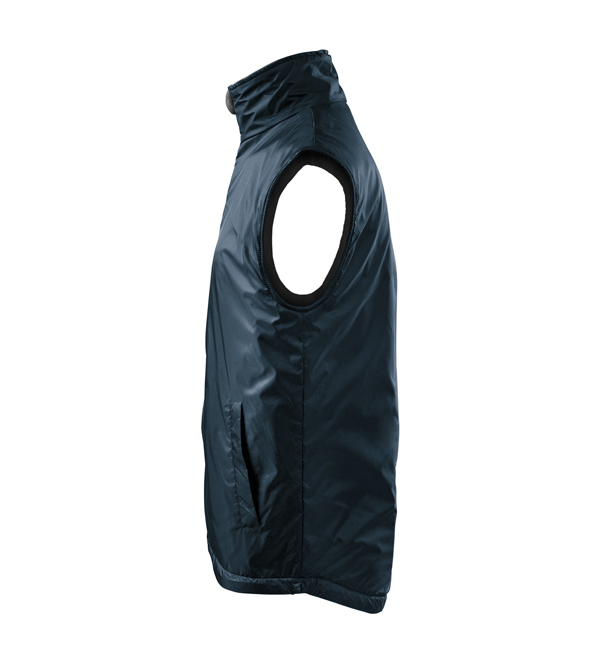Kamizelka męska. Z przodu dwie wszyte kieszenie, podszewka w kolorze kontrastowym. Zapięcie na zamek błyskawiczny, zakładka z polaru - równocześnie zabezpieczające górny brzeg suwaka, możliwość ściągnięcia dolnego brzegu za pomocą elastycznego sznurka ze stoperem. Dwie kieszenie wewnętrzne (1 mniejsza – na telefon komórkowy, 1 większa), wieszaczek, część tylna przedłużona o 6 cm – lepiej chroni ciało (również w ruchu). Doskonałe pod nadruk i haft, dojście przez otwór na suwak (szew boczny podszewki).