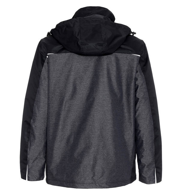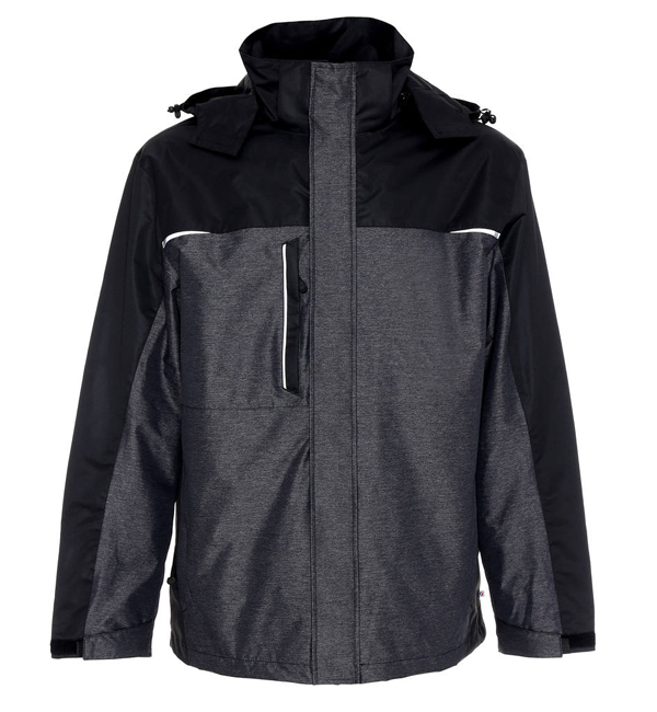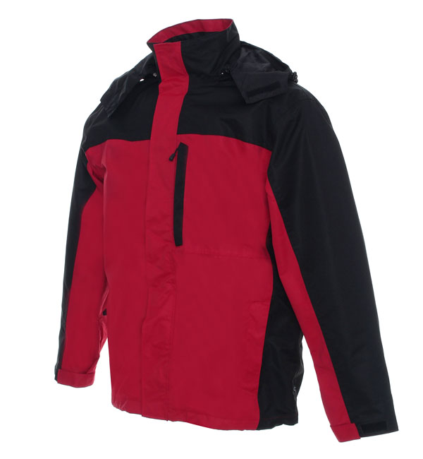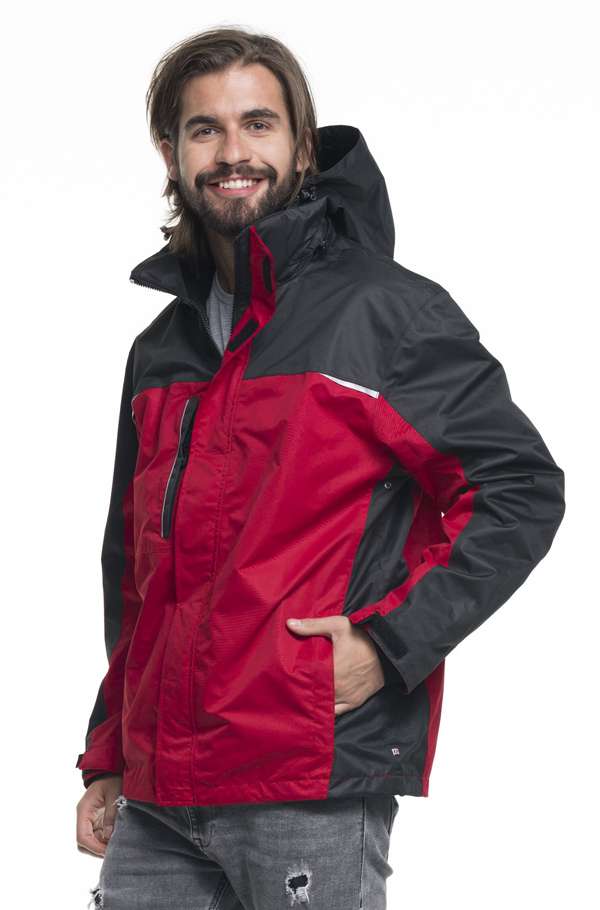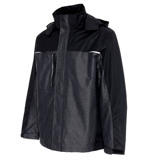 Kurtka męska z odpinanym polarem; trzy kieszenie zewnętrzne zapinane na suwak; system wywietrzników pod pachą; system ściągaczy u dołu wewnątrz; odpinany kaptur; regulowane makiety; wodoodporność 2000mm słupa wody; oddychalność 2000g/m2/24h.