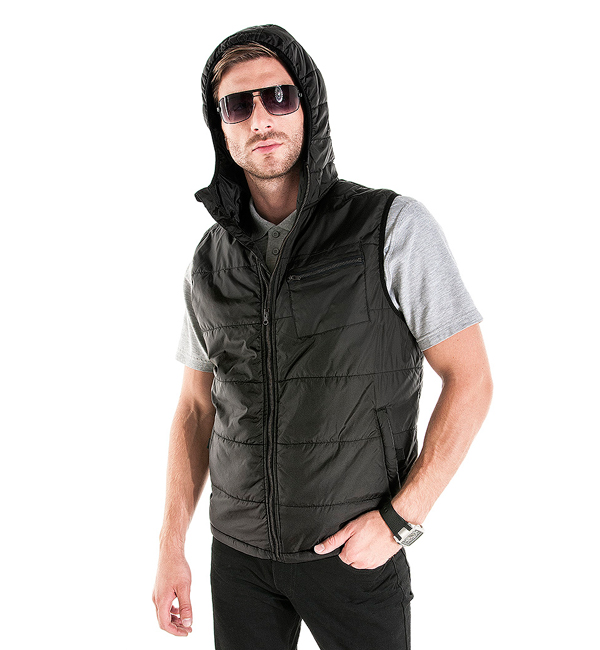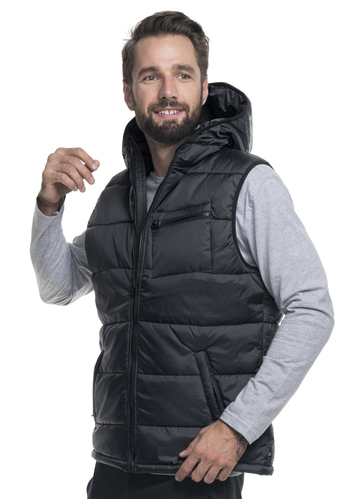 Pikowana kamizelka z kapturem, metalowy zamek główny i kieszeni na piersi, kieszenie boczne zamykane na zamek nylonowy; rękawy i kaptur wykończone elastyczną taśmą