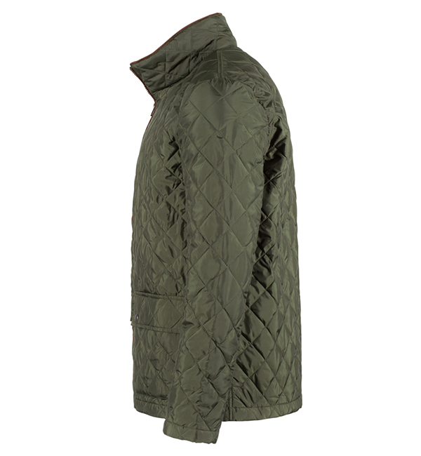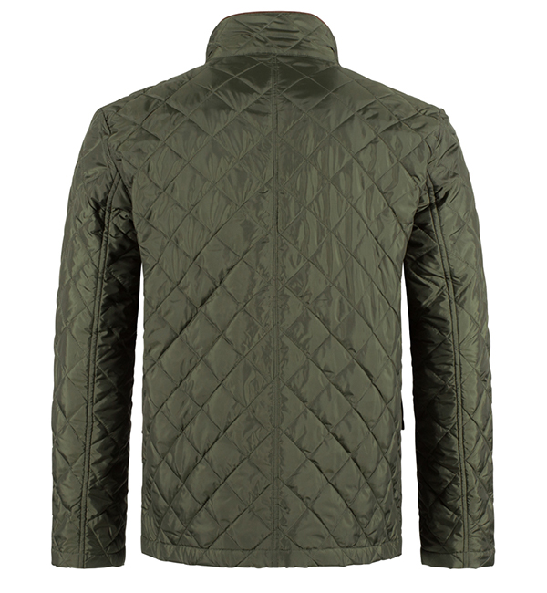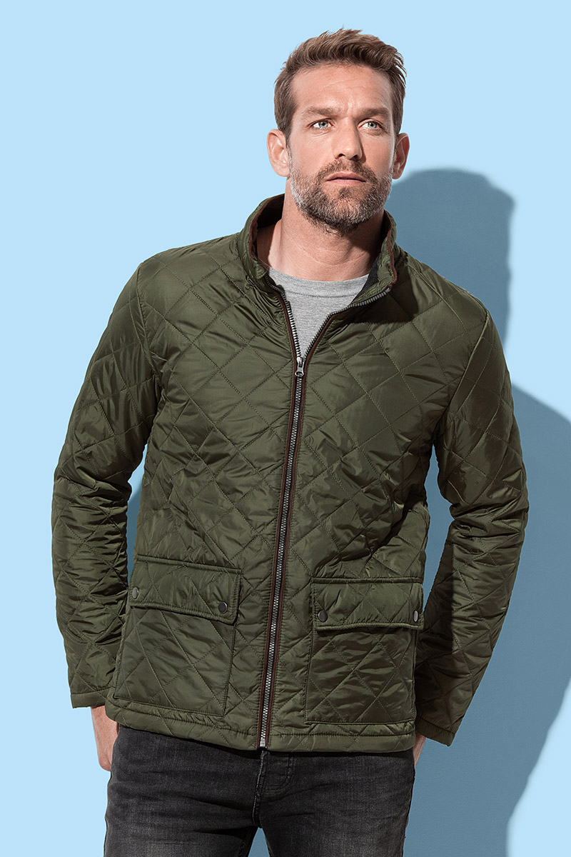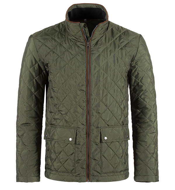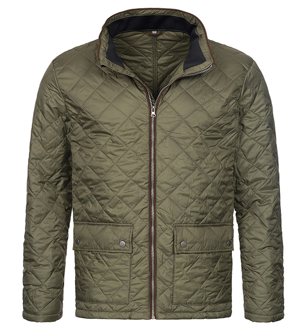 Lekka męska kurtka pikowana z wytrzymałej tkaniny poliestrowej z ciepłym wypełnieniem poliestrowym. Z modnymi detalami, takimi jak lamówka na kołnierzu i z przodu oraz wieszaczek (skóra syntetyczna).
