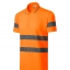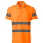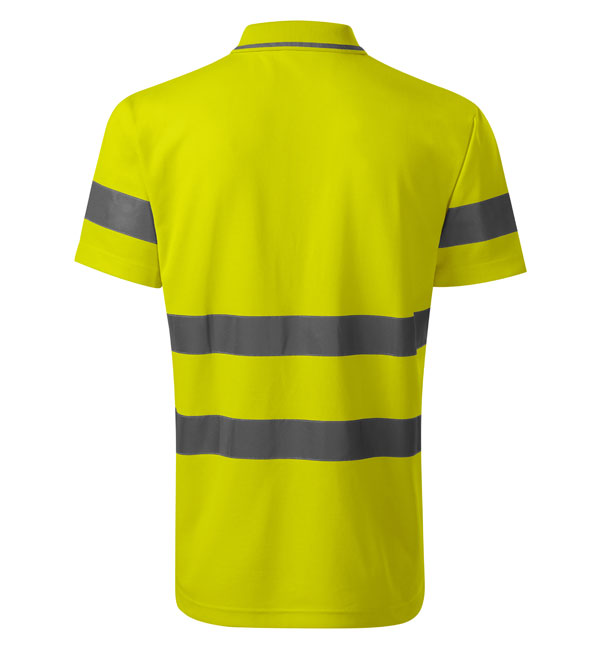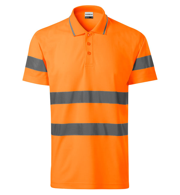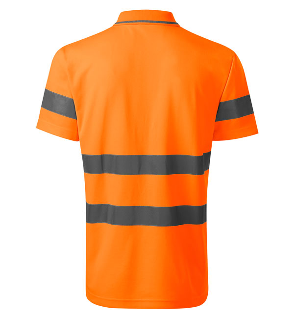 Koszulka polo w kolorze fluoroscencyjnym; krój z bocznymi szwami, kołnierzyk z dzianiny ściągaczowej 1:1 ozdobiony paskiem w kontrastowym kolorze; plisy z 3 guzikami w kolorze materiału; wewnętrzna część lamówki wykończona taśmą z tego samego materiału co koszulka; szew na ramionach wzmocniony taśmą; naszyte certyfikowane taśmy odblaskowe 3M.