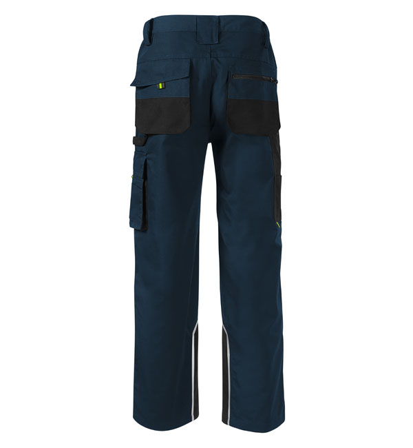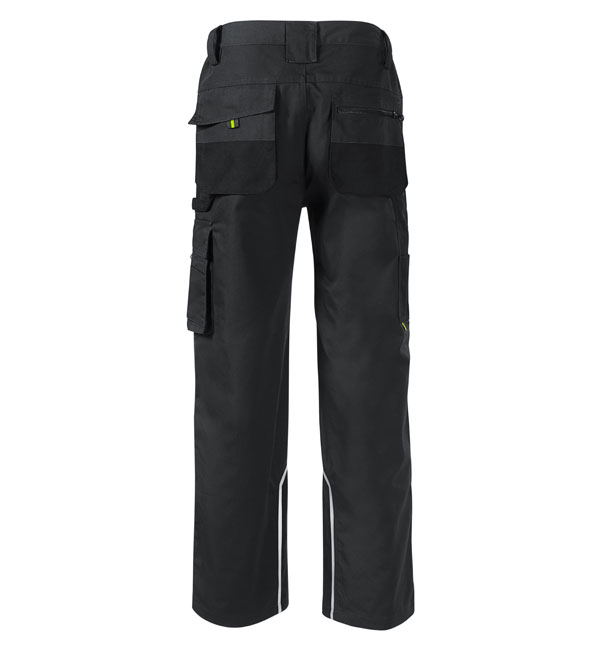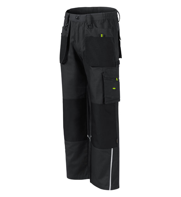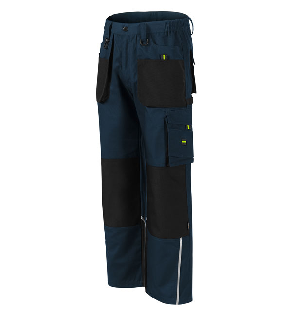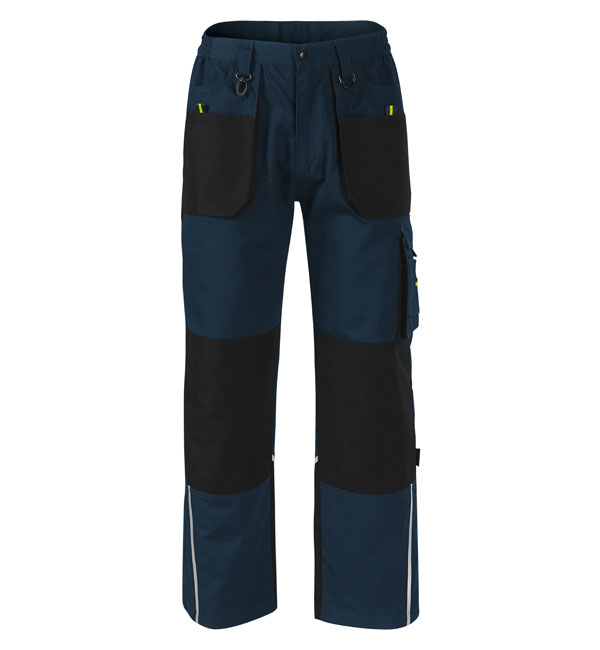 Spodnie robocze dla profesjonalistów. Splot płócienny; taśma odblaskowa w dolnej części nogawek, wielofunkcyjne kieszenie; elastyczne boczne części w pasie; wzmacniająca podwójna warstwa materiału na kolanach, pętelka na młotek; CORDURA w kontrastowym kolorze