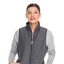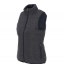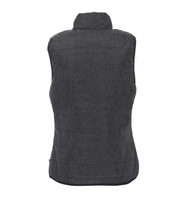 Dwustronna, lekka, pikowana kamizelka; kołnierz ze stójką; dopasowany krój; nylonowy zamek główny i kieszeni; dół kamizelki, ramiona oraz otwory kieszeni wykończone elastyczną taśmą.