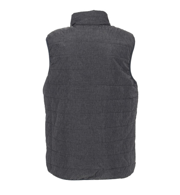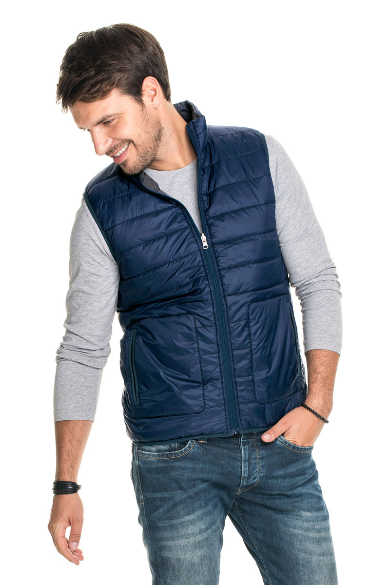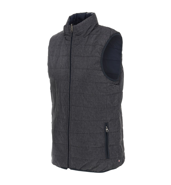 Dwustronna, lekka, pikowana kamizelka; kołnierz ze stójką; dopasowany krój; nylonowy zamek główny i kieszeni; dół kamizelki, ramiona oraz otwory kieszeni wykończone elastyczną taśmą.