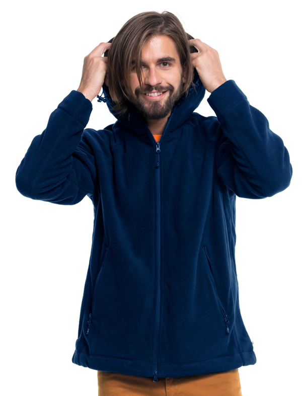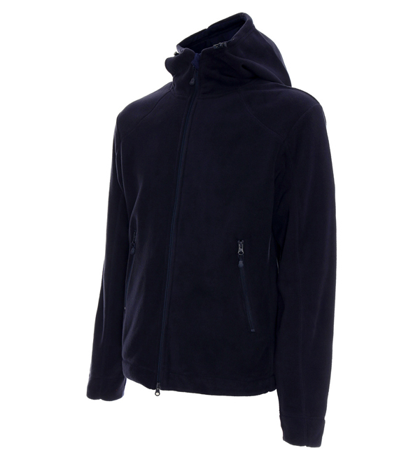 Męski ciepły polar z kapturem; kieszenie zapinane na zamek; system ściągaczy u dołu wewnątrz; zamek dwustronny, ozdobne szwy.