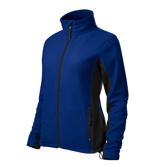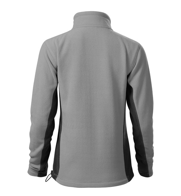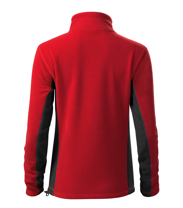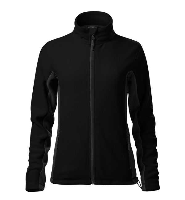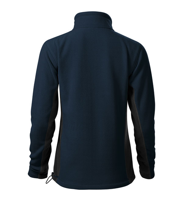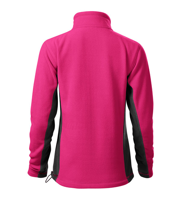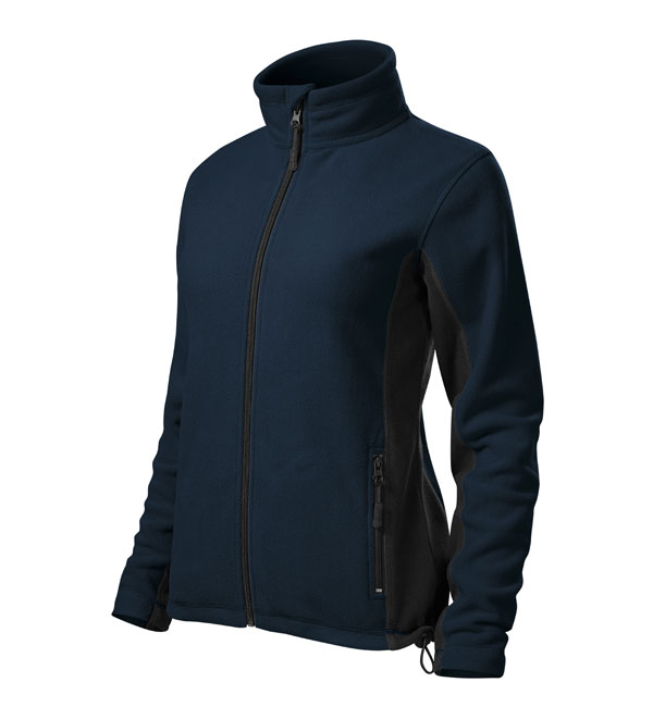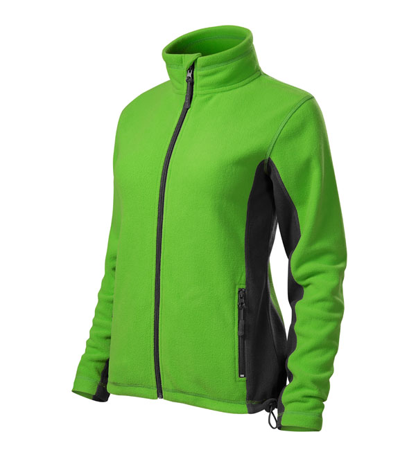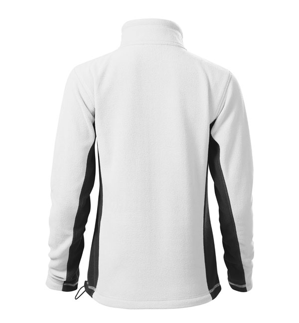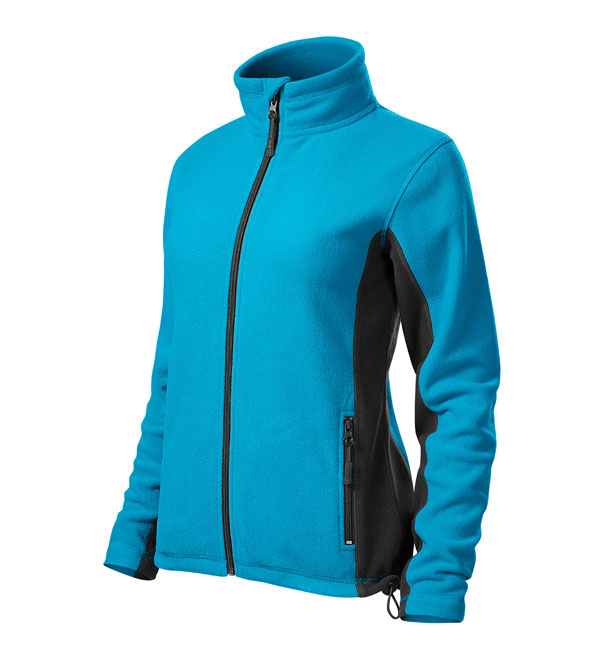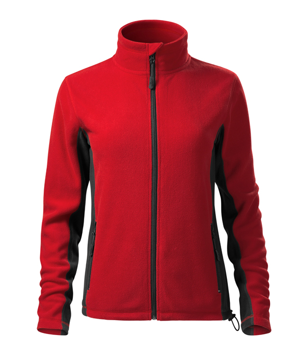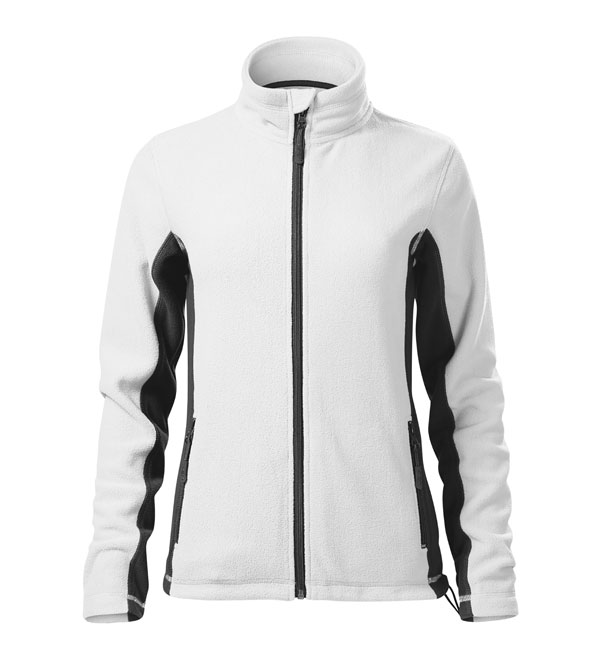 Damski polar wykończony kontrastowymi dodatkami; dopasowany krój; 2 kieszenie przednie zapinane na zamek błyskawiczny; kołnierz stojący z zabezpieczeniem zamka pod brodą; ozdobne szwy; dolny ściągacz regulowany za pomocą elastycznego sznurka; wykończenie antypillingowe na zewnętrznej stronie.