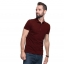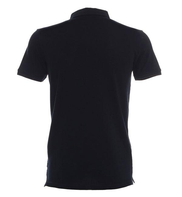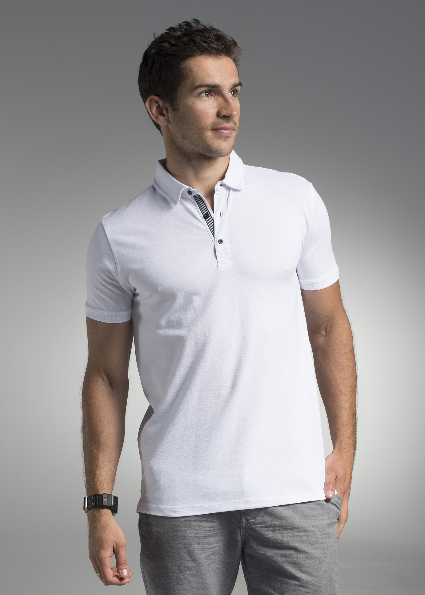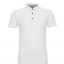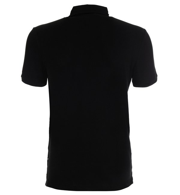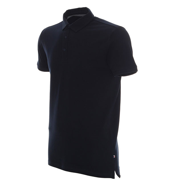 Dzianina typu pique; kołnierz ze stójką; taśma kontrastowa wewnątrz kołnierzyka; 3 guziki; podwójne szwy; rozcięcia na bokach.