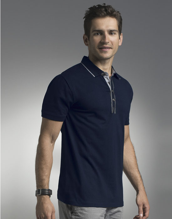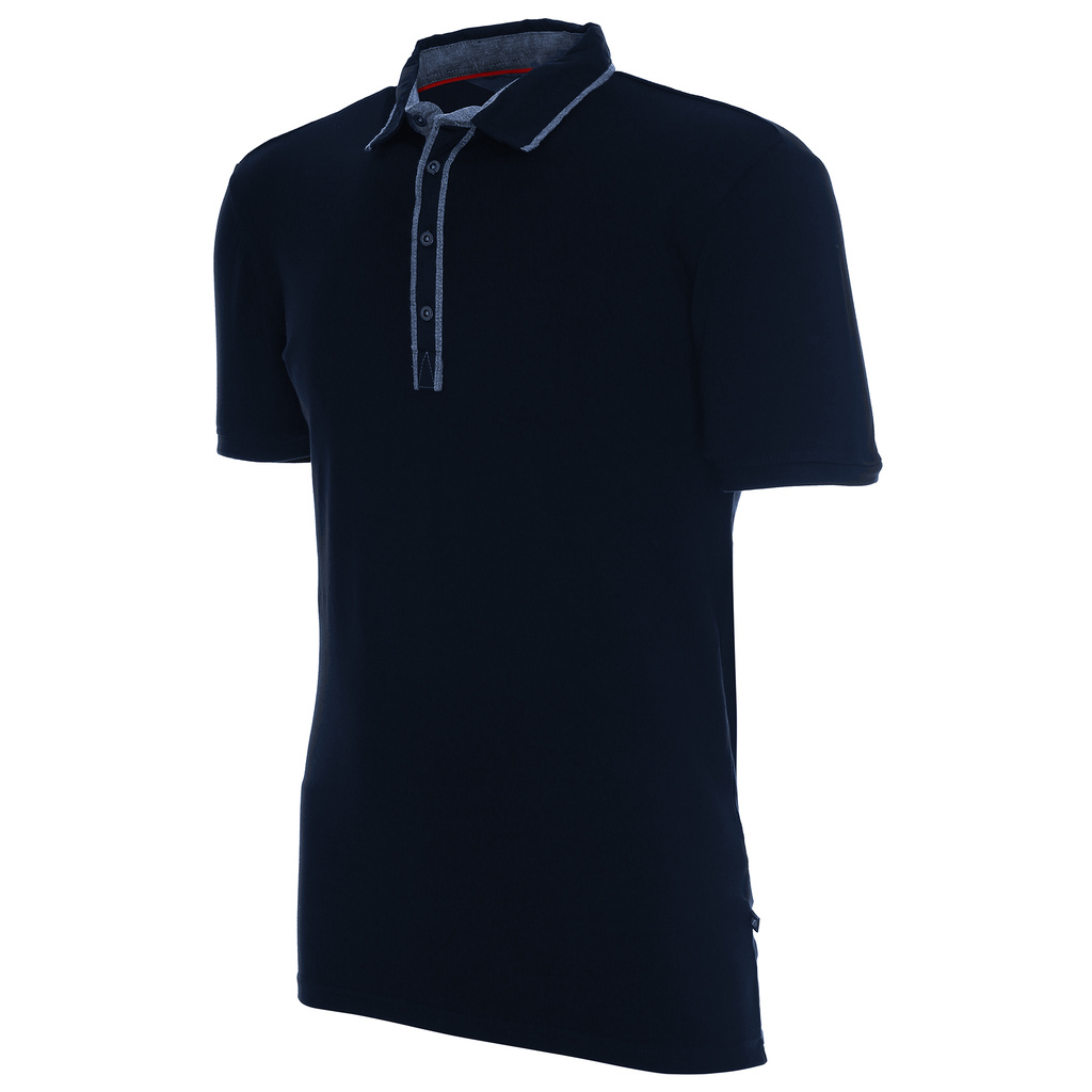 Dopasowany krój; dzianina single jersey; kołnierzyk ze stójką; 4 guziki; rękawki wykończone elastycznym ściągaczem.