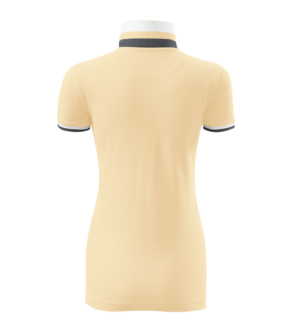 Modna damska koszulka polo z krótkim rękawem ozdobiona detalami w kontrastowym kolorze. Kołnierzyk i rękawy uszyte z dzianin ściągaczowej 1:1. Taśma wokół szyi w kontrastowym kolorze. Kołnierzyk zapinany na 2 guziki ozdobione logiem Malfini. Strona wewnętrzna kołnierzyka przeszyta taśmą w kontrastowym kolorze. Rozcięcia w bocznych szwach wzmocnione taśmą w kontrastowym kolorze.