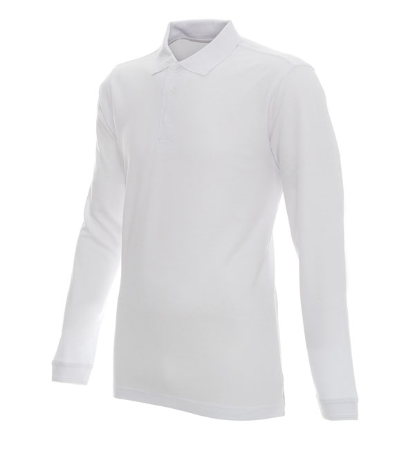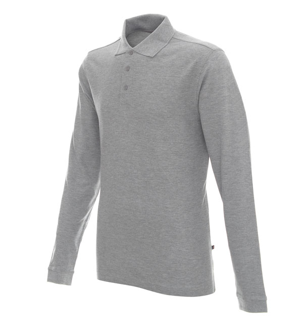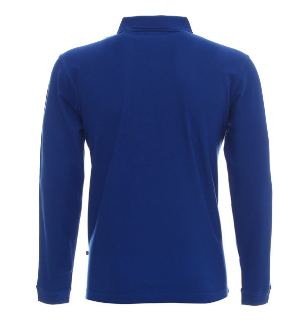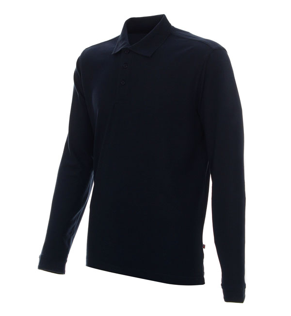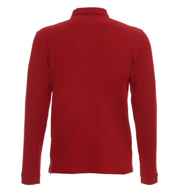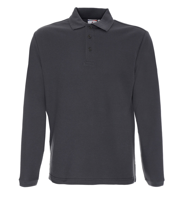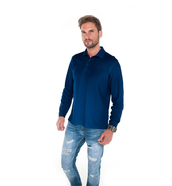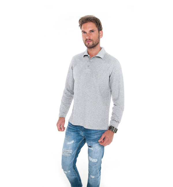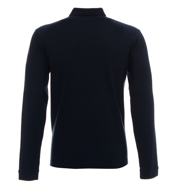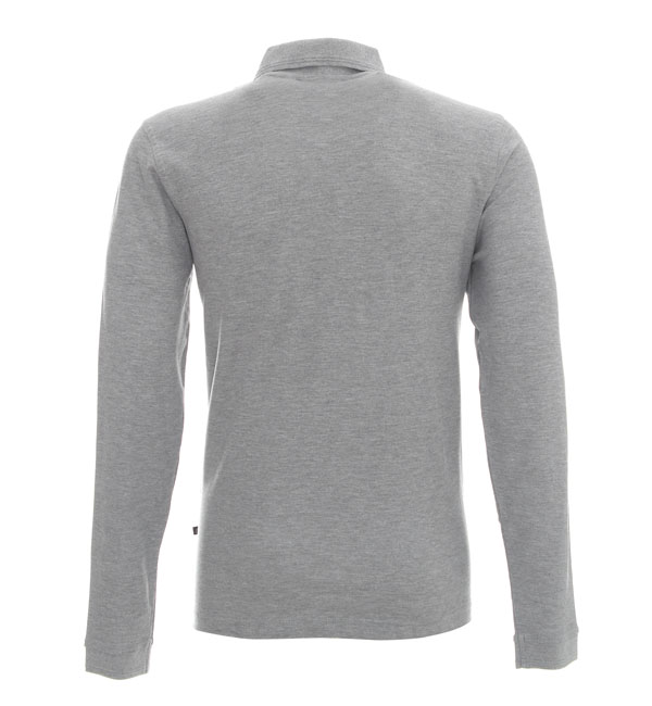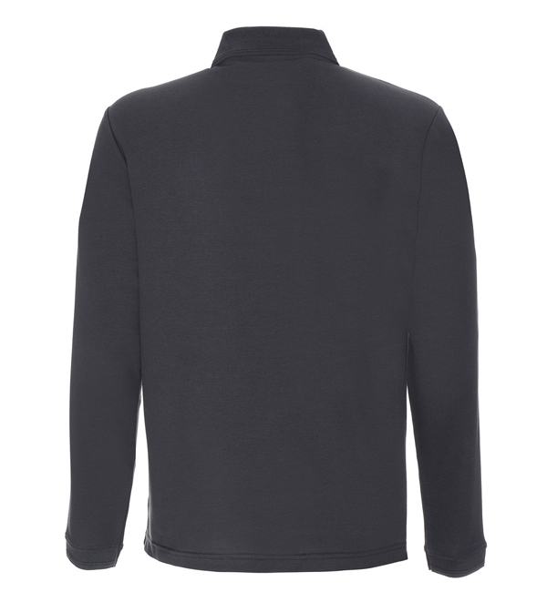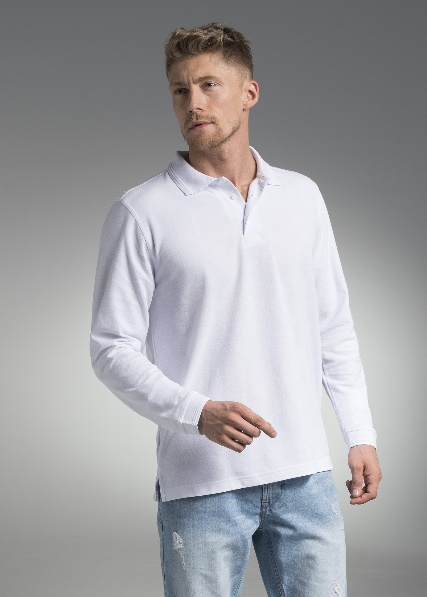 Płaski kołnierz z podwójnymi strukturalnymi paskami; dzianina typu pique; taśma twillowa; rozcięcie na bokach; podwójne szwy.