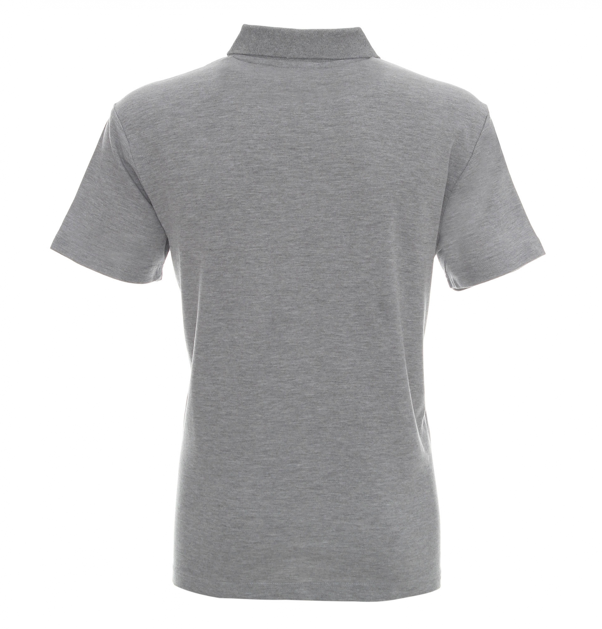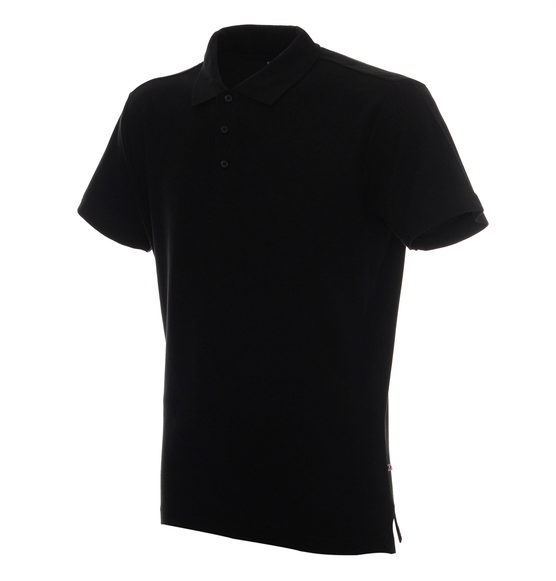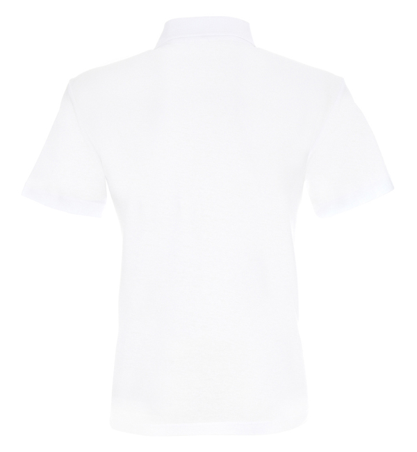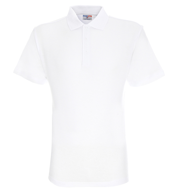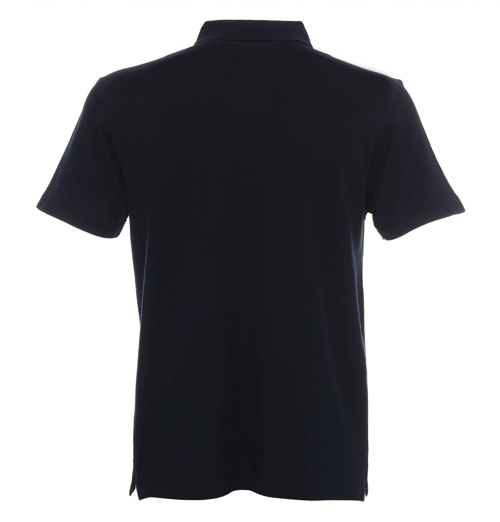 Płaski kołnierz; dzianina typu pique; trzy guziki; rozcięcie na bokach; podwójne szwy.