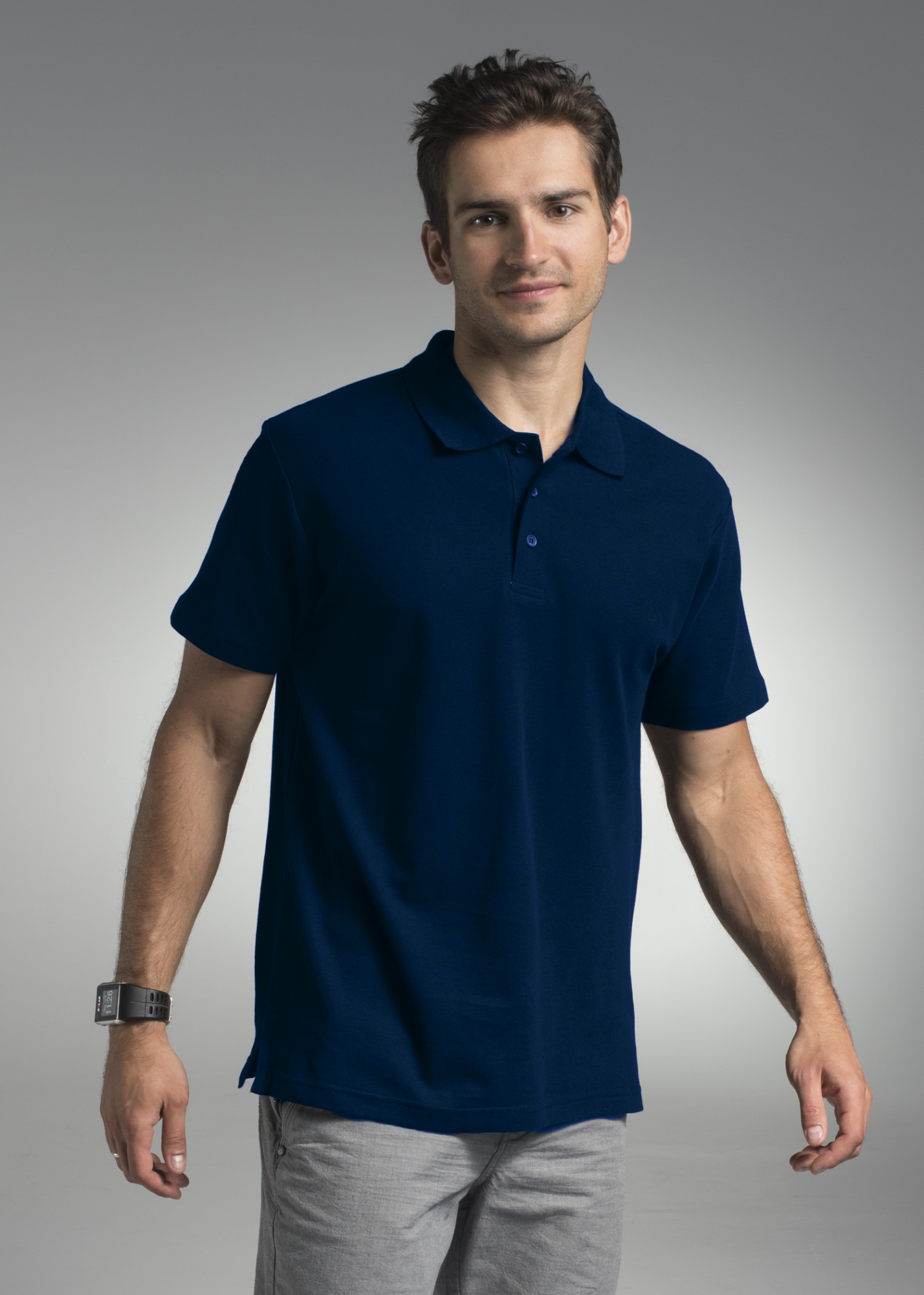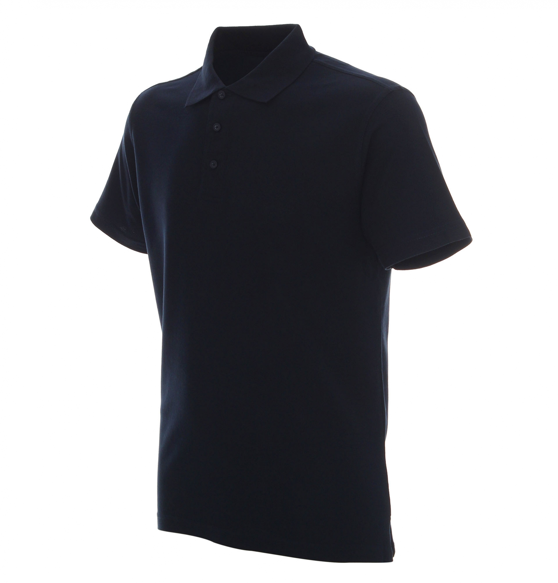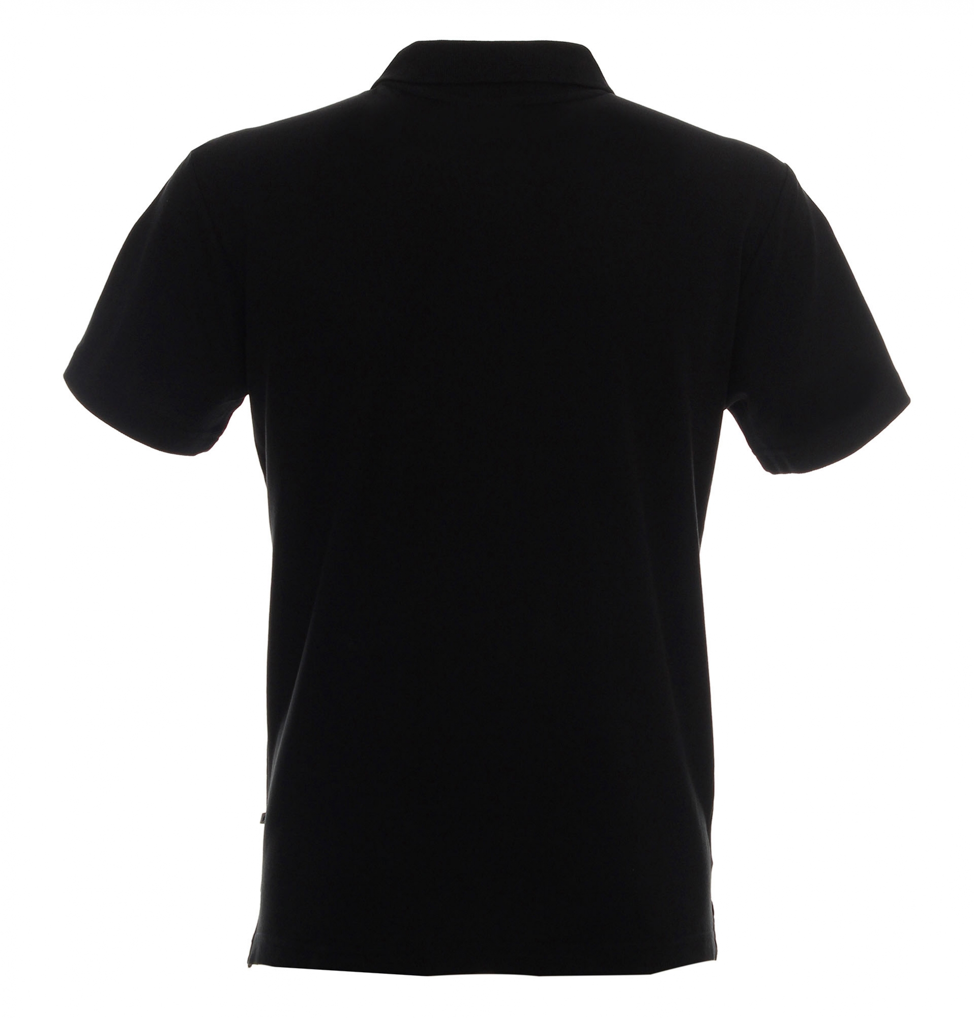 Płaski kołnierz; dzianina typu pique; trzy guziki; rozcięcie na bokach; podwójne szwy.