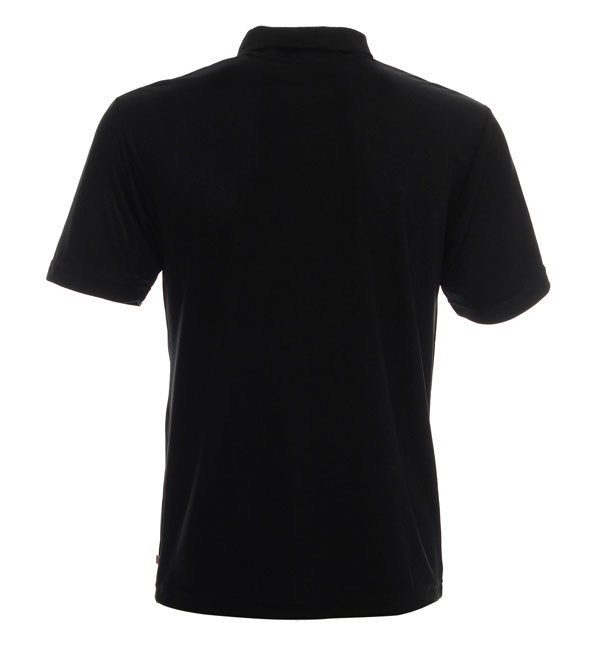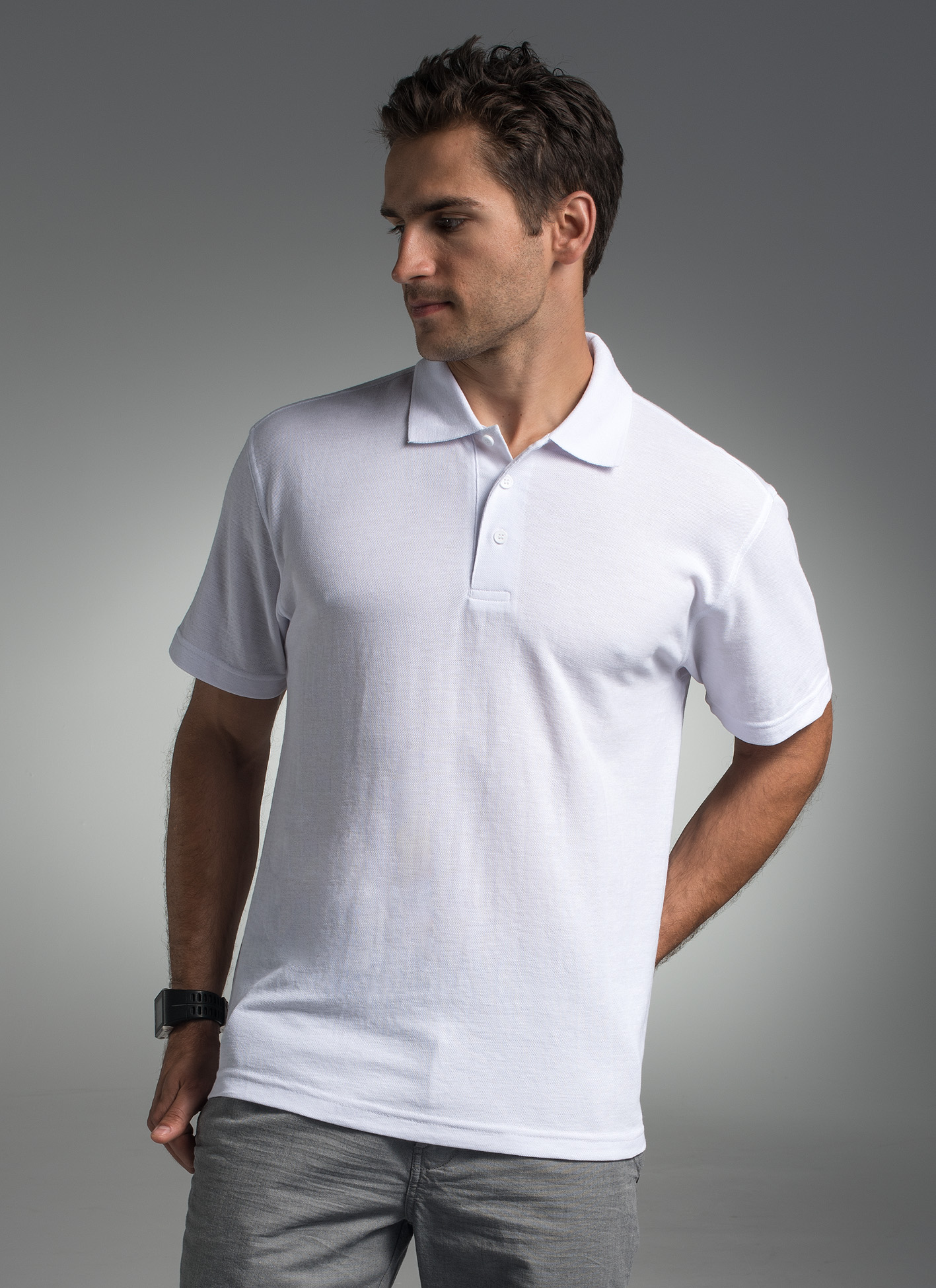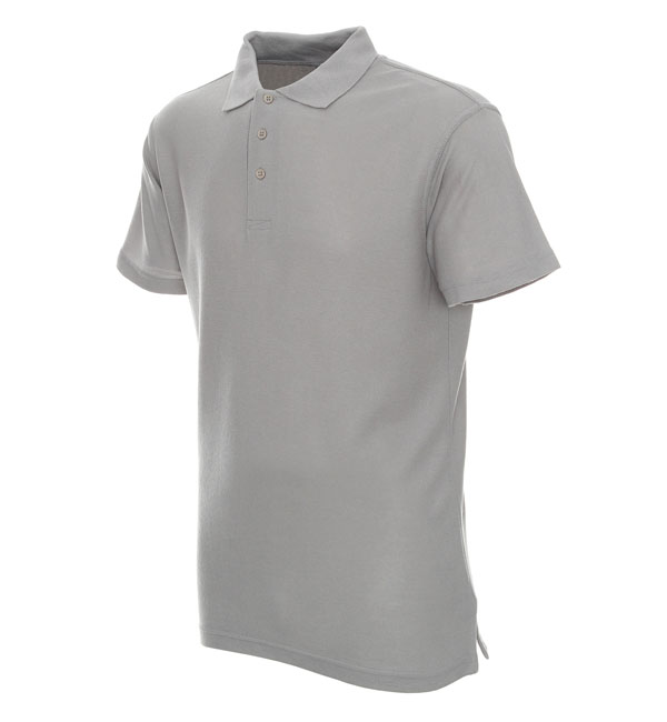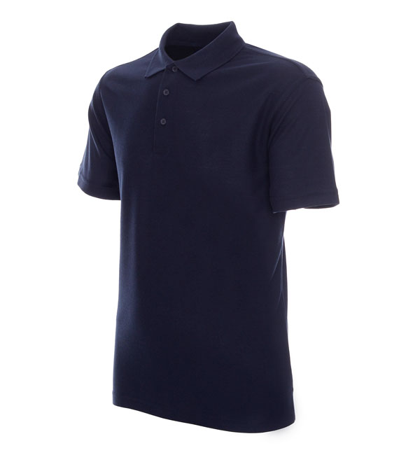 Płaski kołnierz; dzianina typu pique; rozcięcie na bokach; podwójne szwy.