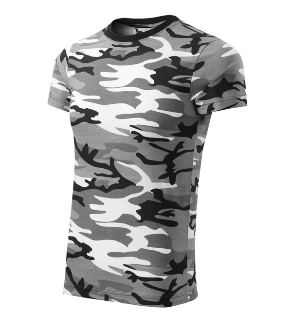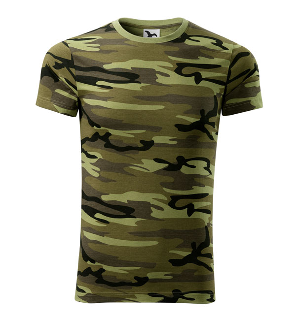 Uniwersalna koszulka o średniej gramaturze w stylistyce moro. Krój z bocznymi szwami. Dekolt wykończony dzianiną ściągaczową z domieszką 5% elastanu. Taśma wokół szyi w kolorze koszulki. Taśma wzmacniająca na ramionach. Odpowiednia do nadruku i haftów